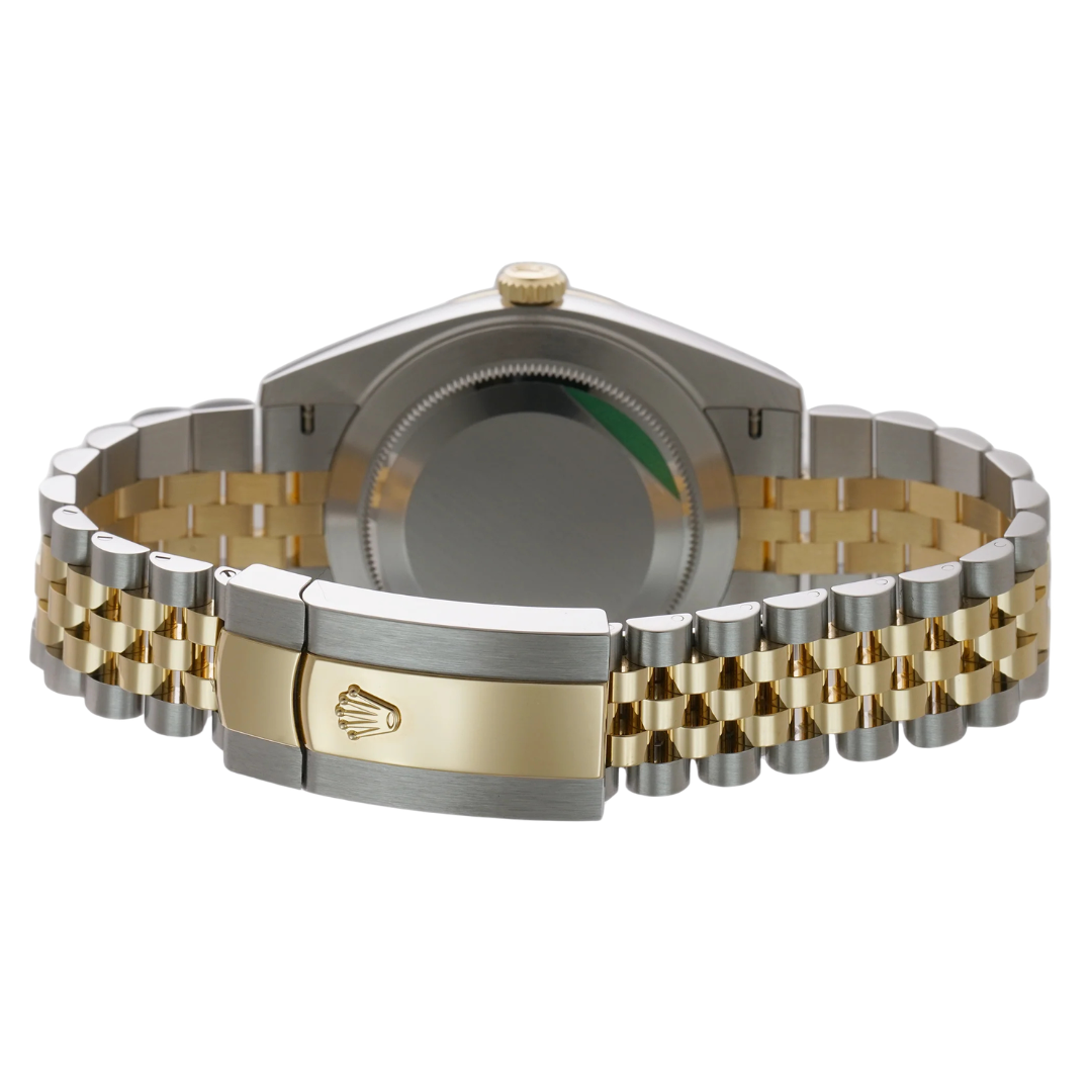 A Rolex Datejust 41 126333, presented in a 41mm Oyster case crafted from stainless steel and 18ct yellow gold, represents one of the most enduring and versatile configurations within the Datejust collection. The clean white dial features applied gold baton hour markers and matching hands, offering a crisp, highly legible display. The signature Cyclops lens at 3 o’clock enhances the date function, while the fluted yellow gold bezel delivers the unmistakable light reflection that defines this iconic model.