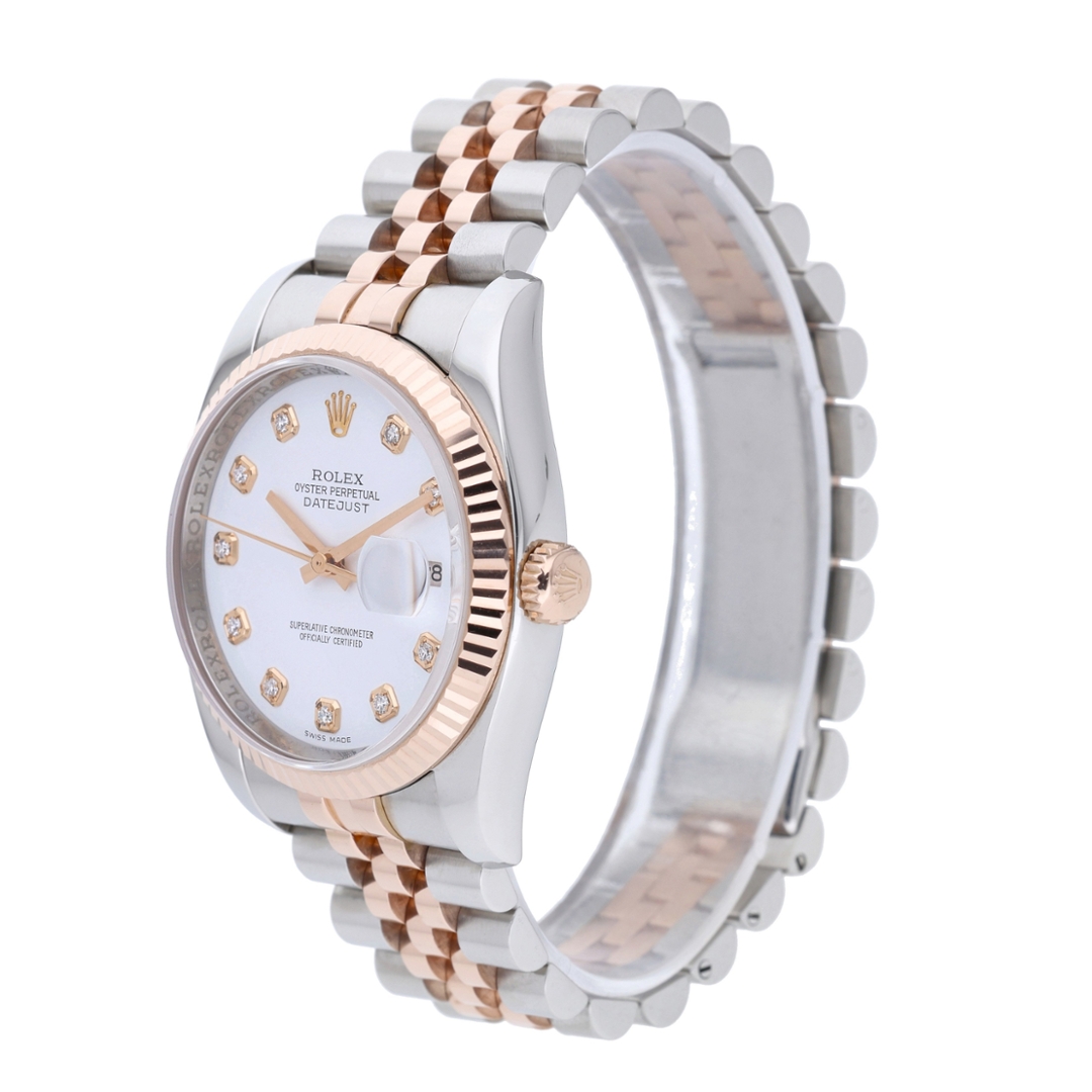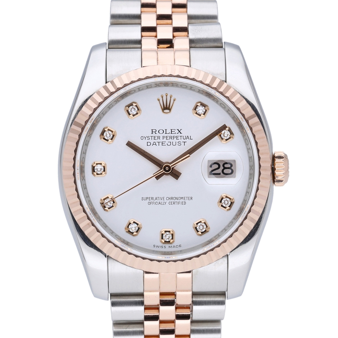 A Rolex Datejust 116231 is a timepiece that epitomises timeless elegance and enduring craftsmanship. Crafted in stainless steel with luxurious 18ct rose gold, this 36mm model showcases Rolex’s famed two-tone design, perfectly balancing refinement with everyday wearability. Its fluted bezel in rose gold complements the white dial, which is beautifully set with original Rolex diamond numerals, adding both prestige and subtle brilliance. The Jubilee bracelet enhances comfort and versatility, making it a watch suited for any occasion.