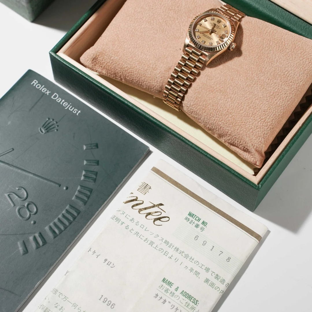 Powered by a Rolex automatic movement, offering dependable precision and long-term reliability. The 26mm case size provides an elegant and refined wrist presence, while the President bracelet enhances both comfort and prestige, making this a standout example of a classic ladies’ Rolex.
