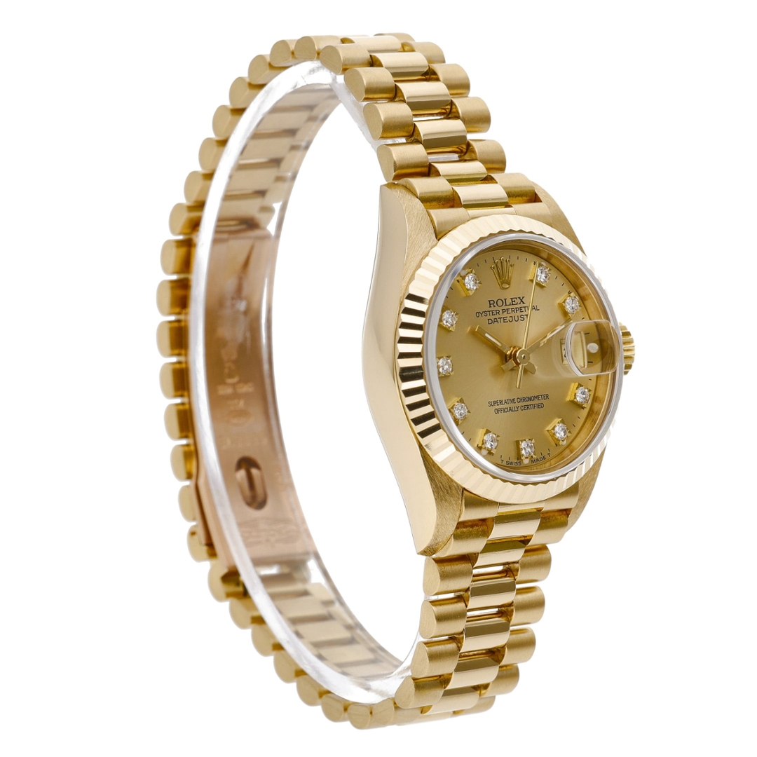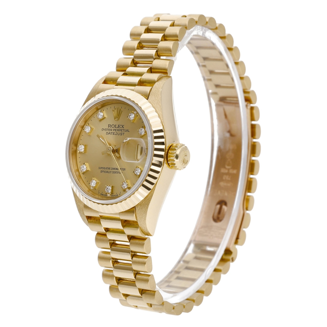 A Rolex Datejust reference 69178 in full 18ct yellow gold, featuring a classic champagne dial set with original Rolex diamond hour markers. The rich gold tones are perfectly matched to the fluted 18ct yellow gold bezel and President bracelet, delivering a timeless, luxurious aesthetic that defines the traditional Datejust design.