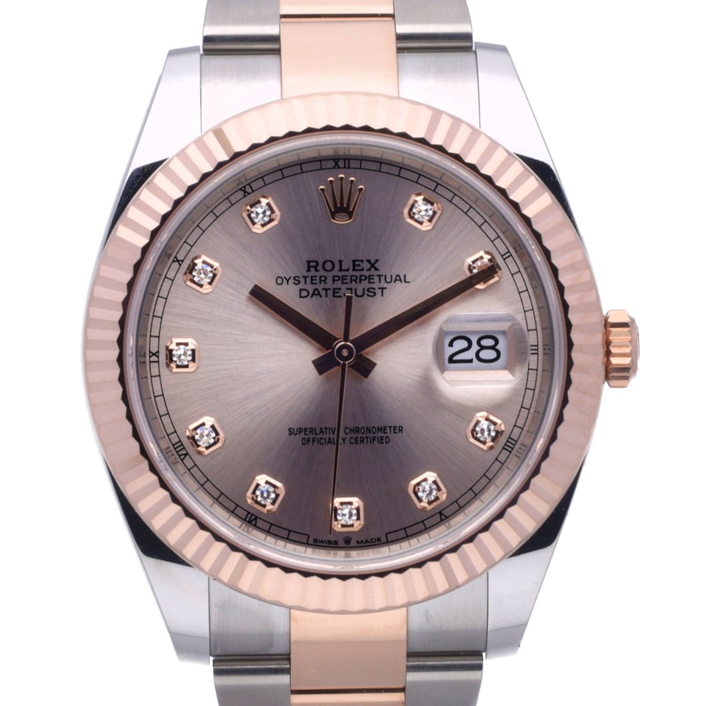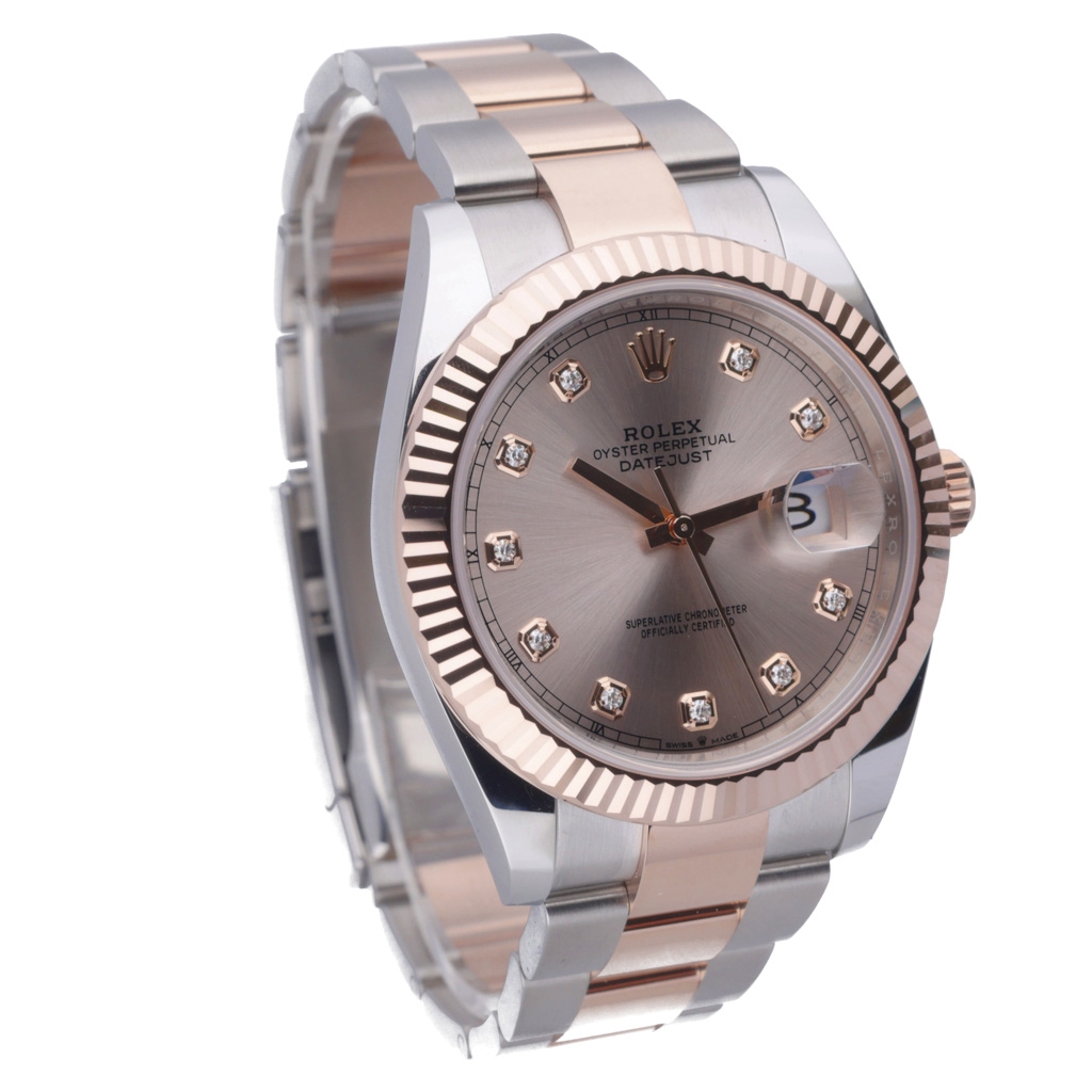 A Rolex Datejust 41 126331 Watch, crafted in stainless steel and 18ct Everose gold, featuring an 18ct Everose gold fluted bezel and the elegant Sundust dial set with original Rolex diamond hour markers. This refined two-tone configuration offers a warm, understated look, with the sunburst dial finish enhancing depth and contrast against the diamond-set indices.