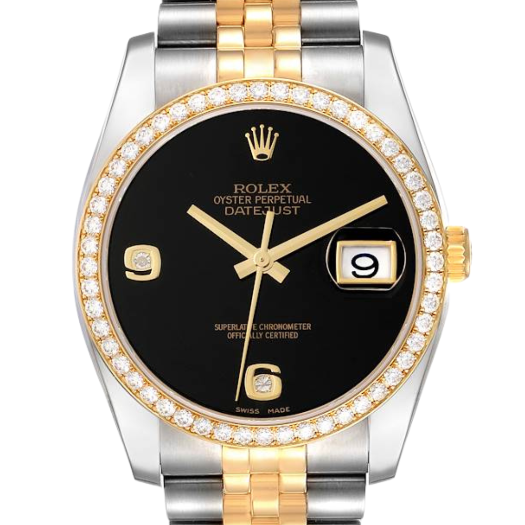 A Bi-Metal Rolex Datejust Watch, Stainless Steel and 18ct Yellow Gold with an Original Diamond Bezel and Diamond 6 + 9 Numerals on a Black Dial.