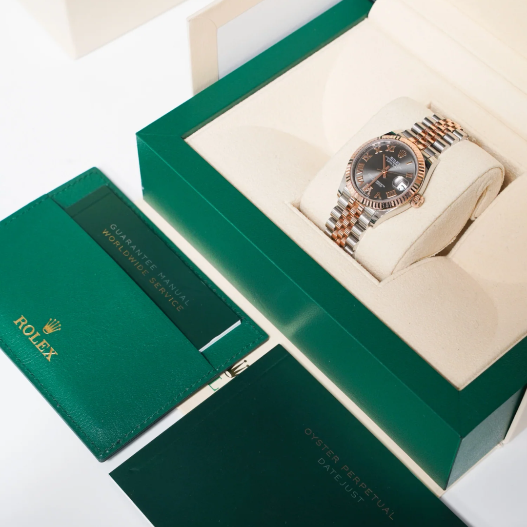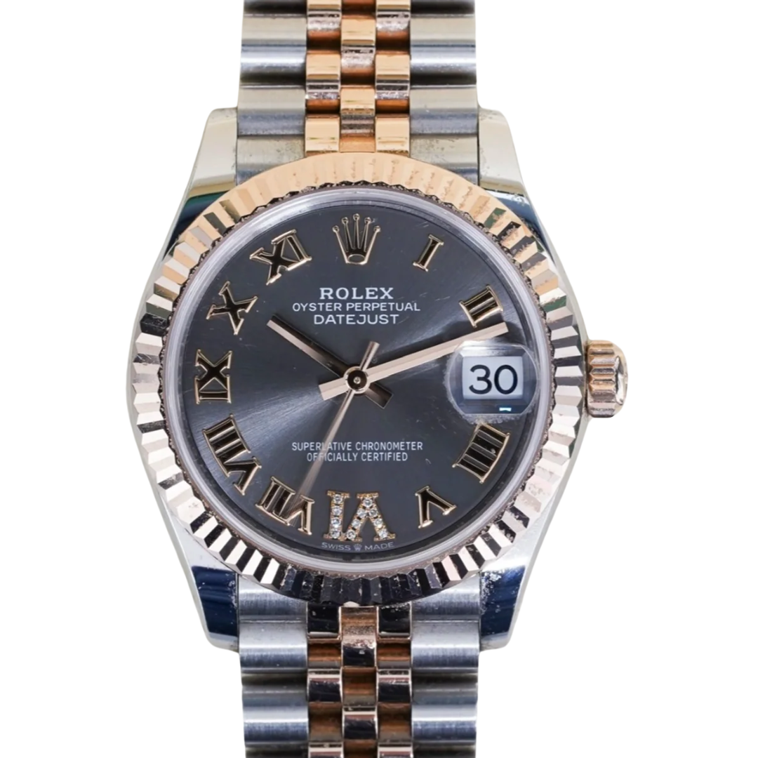A Rolex Datejust 31 reference 278271 in stainless steel and 18ct Everose gold, featuring an 18ct Everose gold fluted bezel and a striking rhodium dial with applied Roman numerals and a diamond-set VI. The contrast between the dark rhodium dial and warm Everose tones creates a distinctive and modern take on the classic Datejust aesthetic.