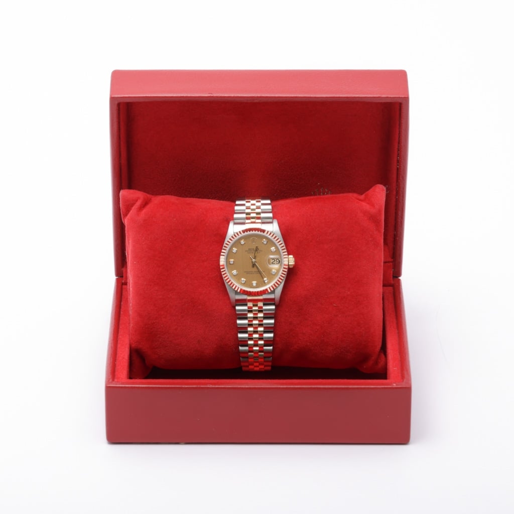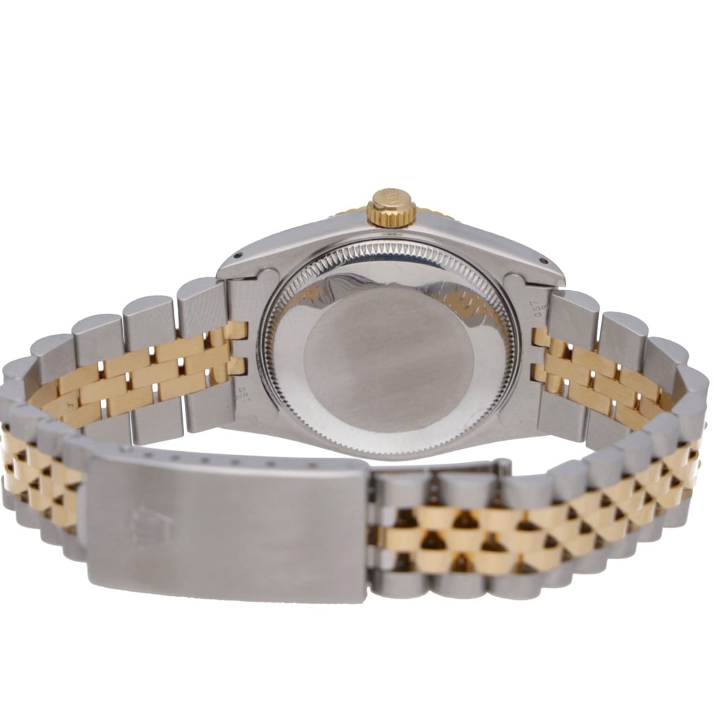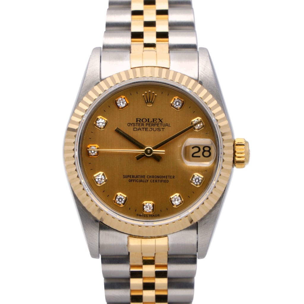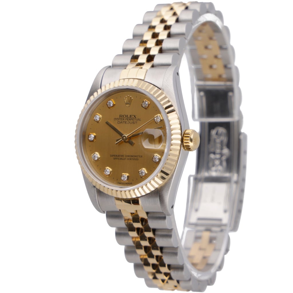 A bi-metal Rolex Datejust reference 68273, crafted in stainless steel and 18ct yellow gold, featuring a 31mm Oyster case paired with a yellow gold fluted bezel. The champagne dial is fitted with original Rolex diamond hour markers, offering a classic and highly recognisable Datejust aesthetic from the early 1990s.