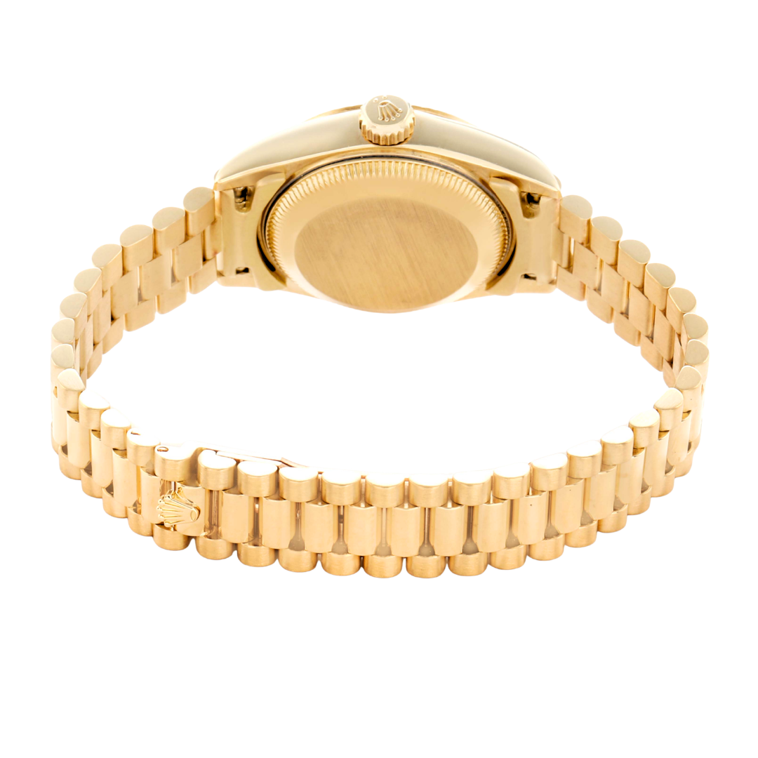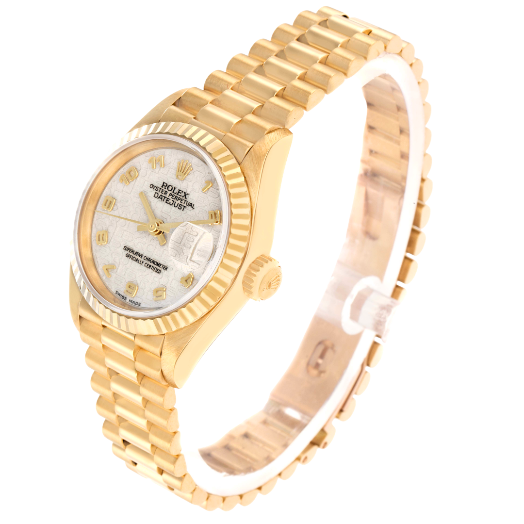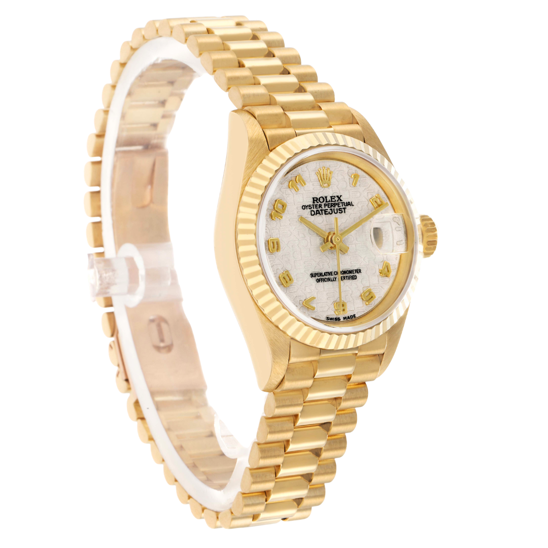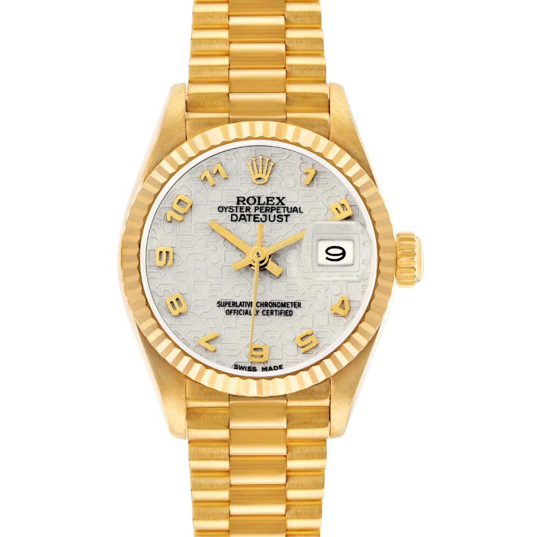 A Rolex Datejust reference 69178 in full 18ct Yellow Gold, featuring a fluted 18ct Yellow Gold bezel and a white Jubilee dial with applied yellow gold Arabic numerals. The dial displays the embossed Jubilee pattern throughout, with gold hands and a date aperture at 3 o’clock with Cyclops lens. The 26mm Oyster case presents a refined profile, with the textured dial adding a distinctive and recognisable variation to the classic Datejust configuration.