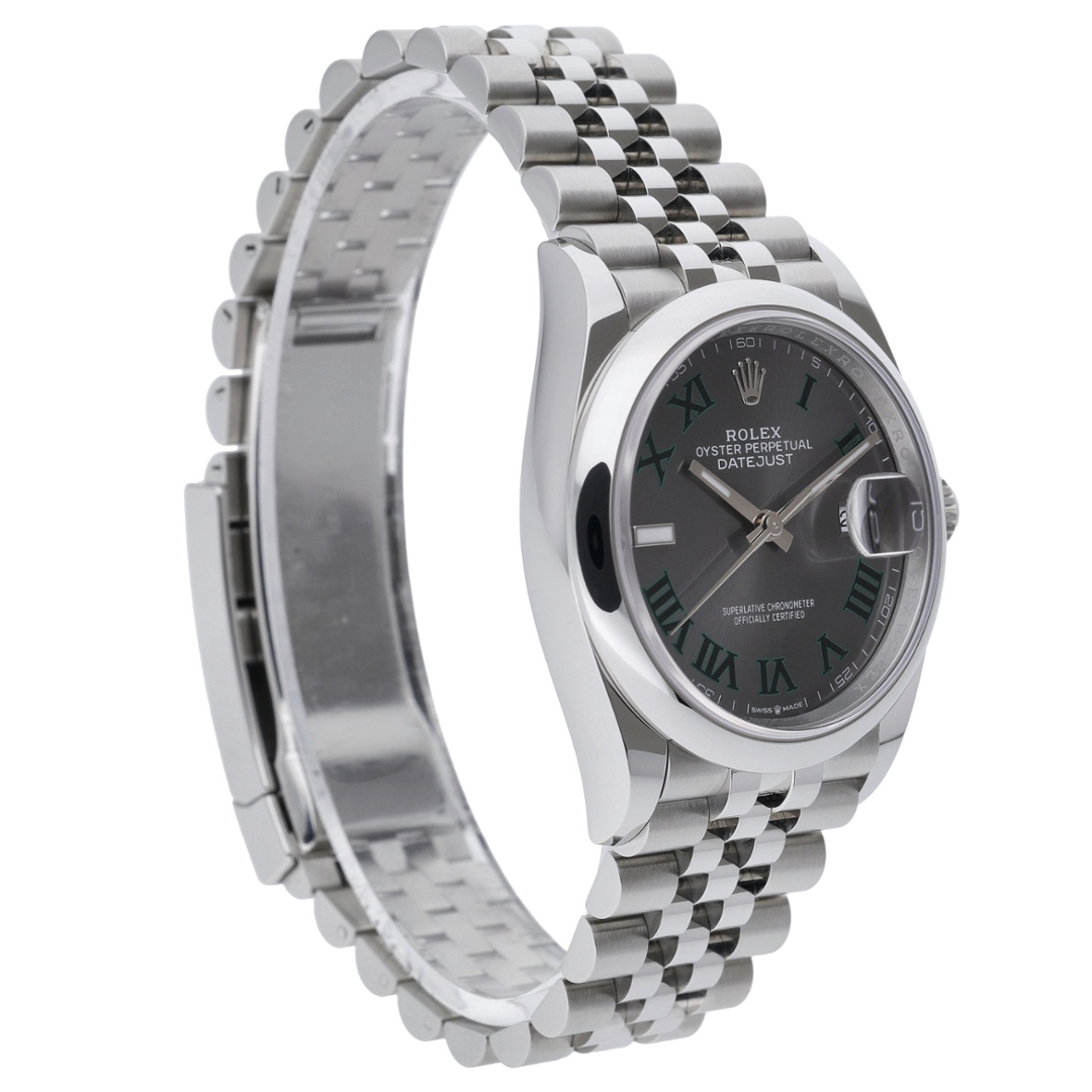 A Rolex Datejust 126200, a sleek, modern iteration of the classic Datejust, is a stunning timepiece that combines precision, style, and versatility. This model is crafted from stainless steel, offering robustness and a refined aesthetic. The 36mm case provides a more significant wrist presence while maintaining a timeless, elegant profile. The slate dial is striking, offering a dark, sophisticated hue that contrasts beautifully with the polished silver hour markers and hands. This contemporary colour choice gives the watch a unique, understated look that is versatile for any occasion.