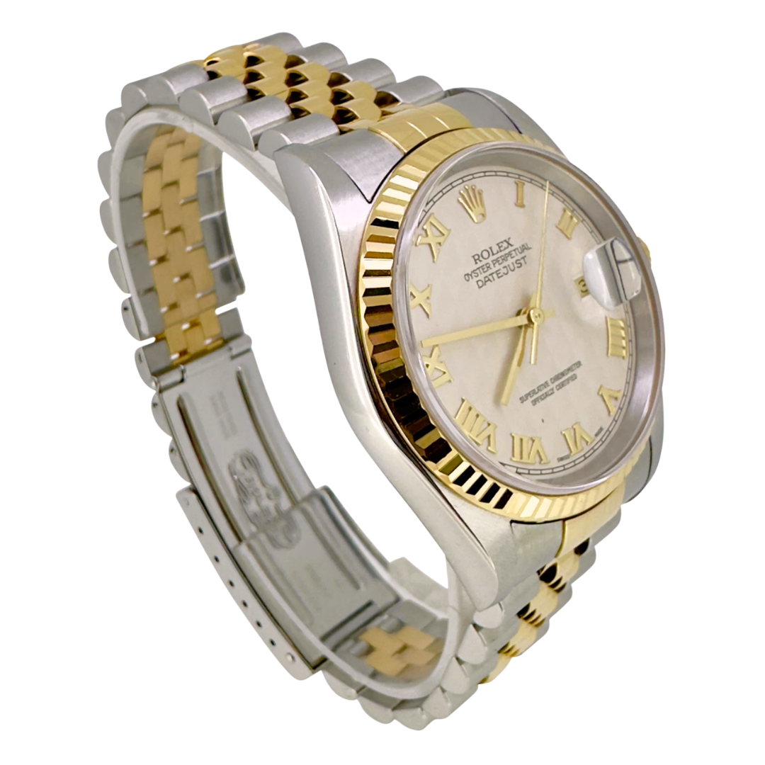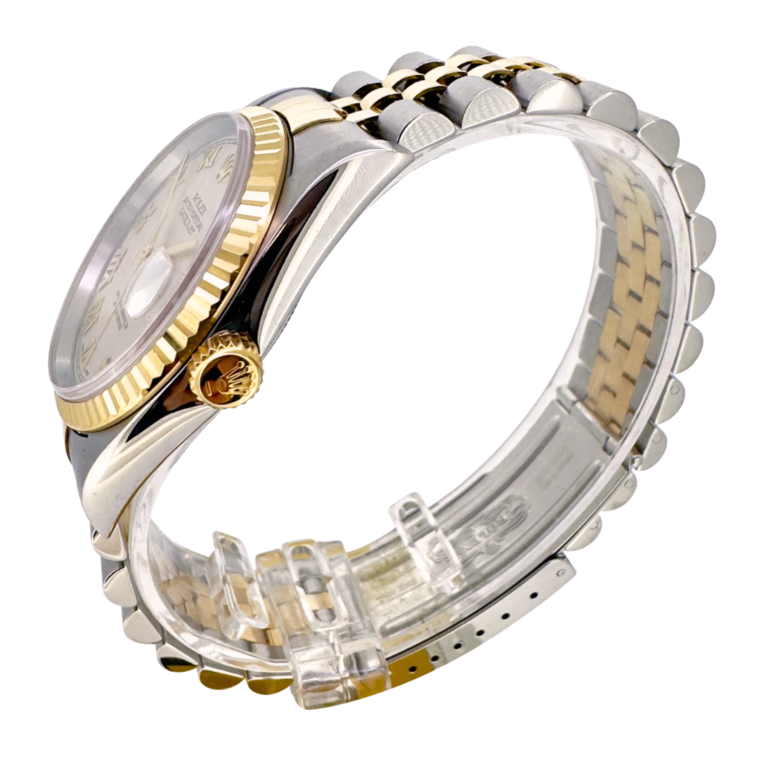 A Rolex Datejust 16233, crafted in stainless steel and 18ct yellow gold, featuring a white pyramid dial with applied yellow gold Roman numerals and a matching fluted bezel. The textured dial adds depth and character to this classic configuration, giving it a more distinctive presence than standard finishes while retaining the timeless Datejust aesthetic.