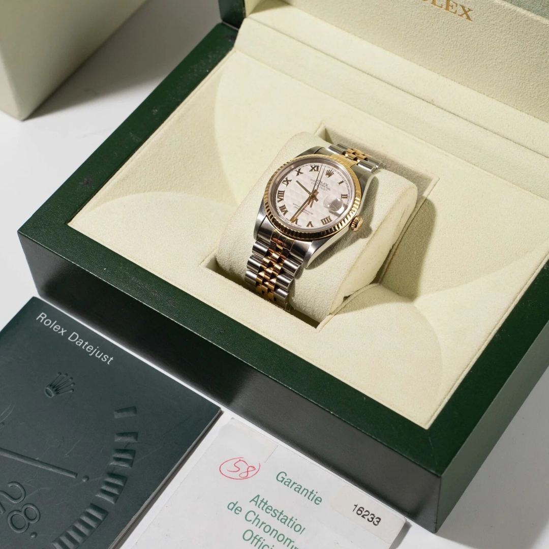 The 36mm Oyster case houses the Rolex Calibre 3135 automatic movement, renowned for its durability, precision, and ease of servicing. Paired with the Jubilee bracelet, this reference represents one of the most enduring and recognisable combinations within the Datejust range, balancing everyday wearability with classic Rolex design.