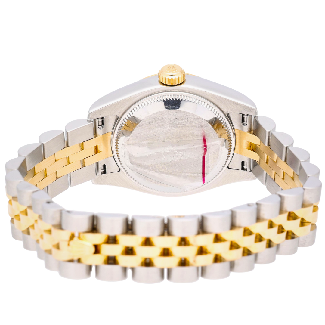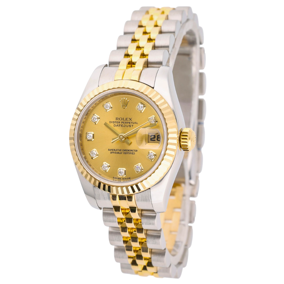 A bi-metal Rolex Datejust 179173, combining stainless steel and 18ct yellow gold with the classic fluted bezel and matching Jubilee bracelet. This 26mm model is elevated by a champagne dial set with original Rolex diamond hour markers, delivering a refined and unmistakably luxurious aesthetic that remains timeless within the Datejust range.