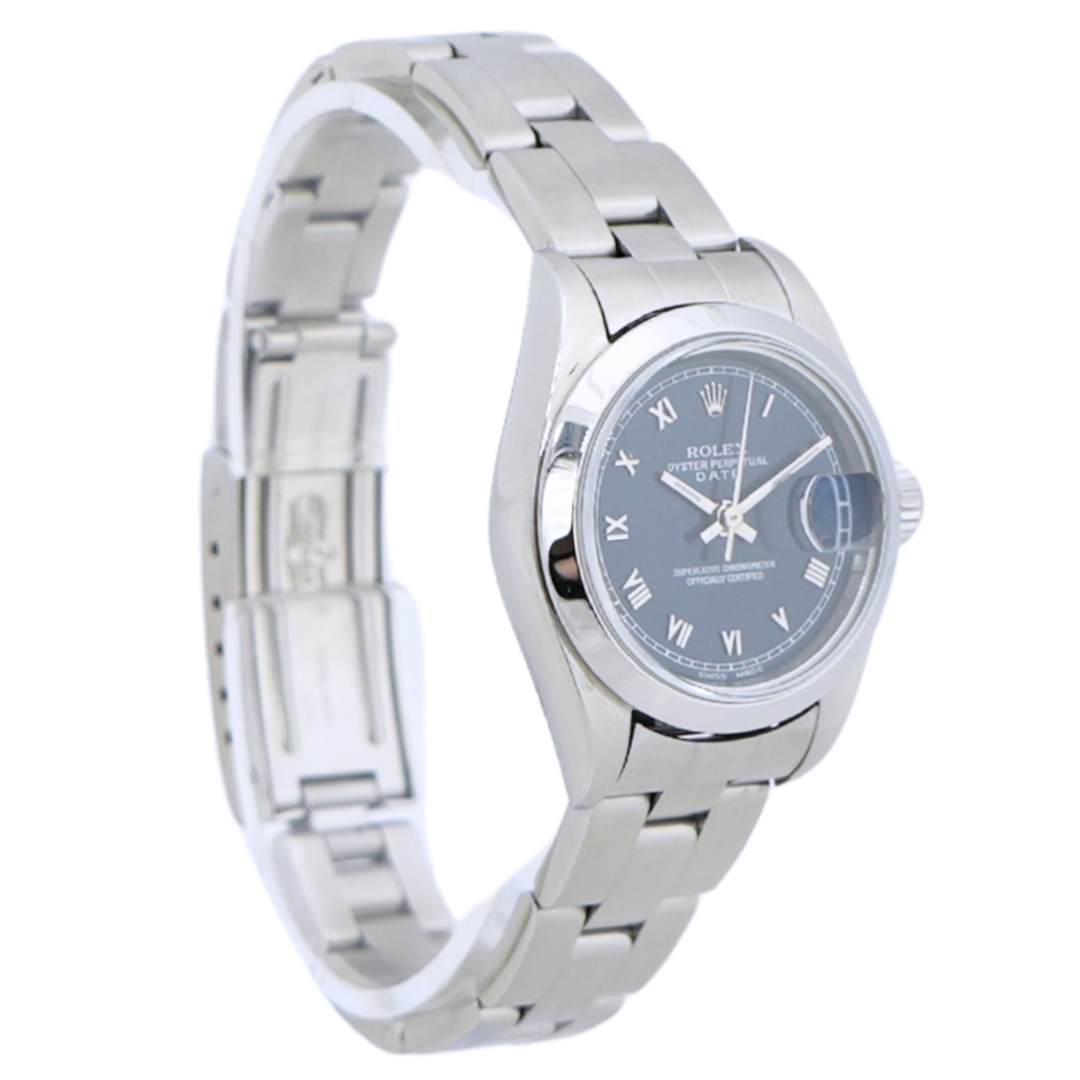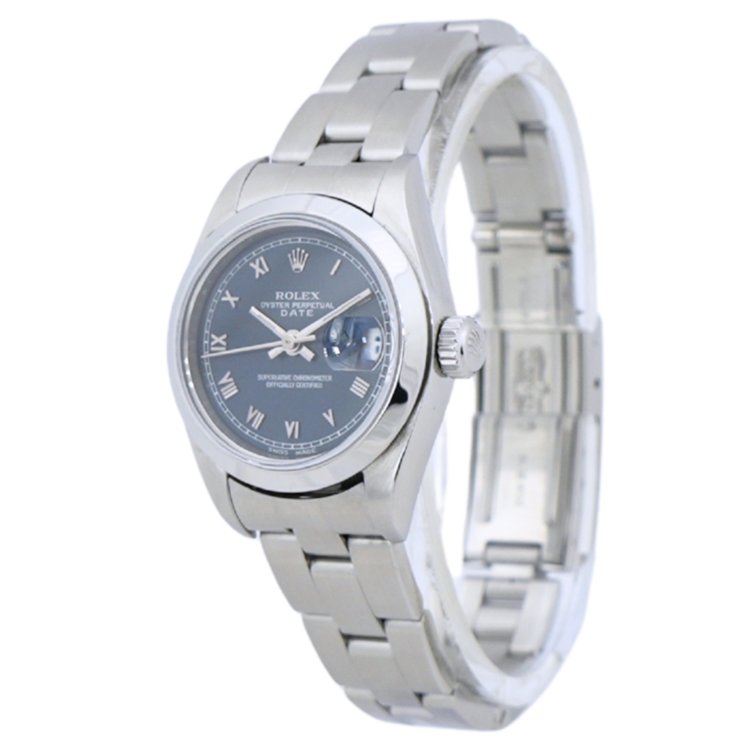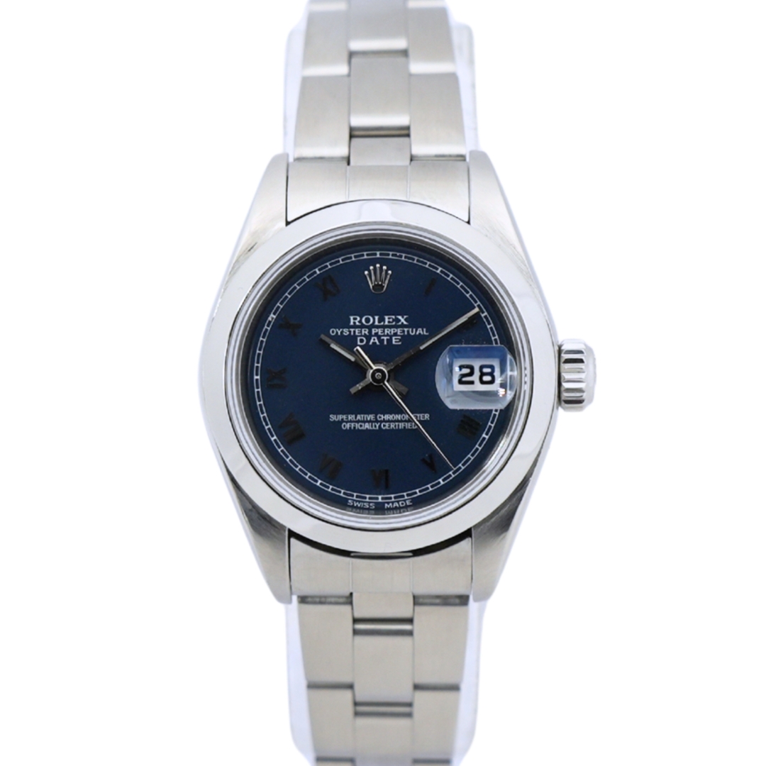 A Rolex Datejust, reference 79160, presents a perfect balance of classic elegance and timeless design. Crafted entirely from stainless steel, this refined 26mm model showcases the signature smooth bezel and a striking blue dial adorned with crisp Roman numeral hour markers. The vivid blue tone adds a touch of sophistication and individuality, while the dial layout remains unmistakably Rolex — clean, balanced, and effortlessly stylish.