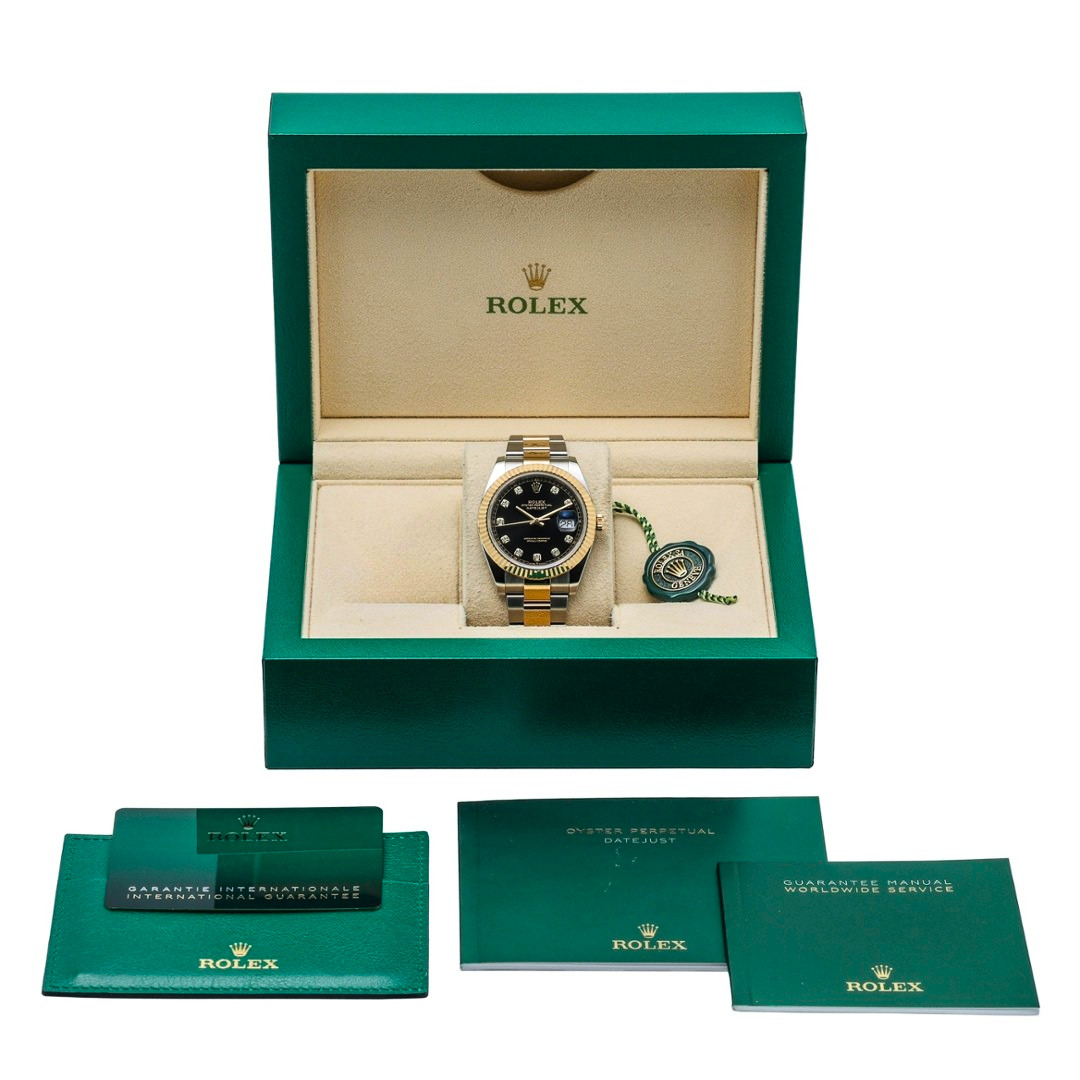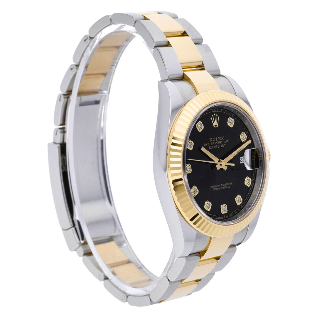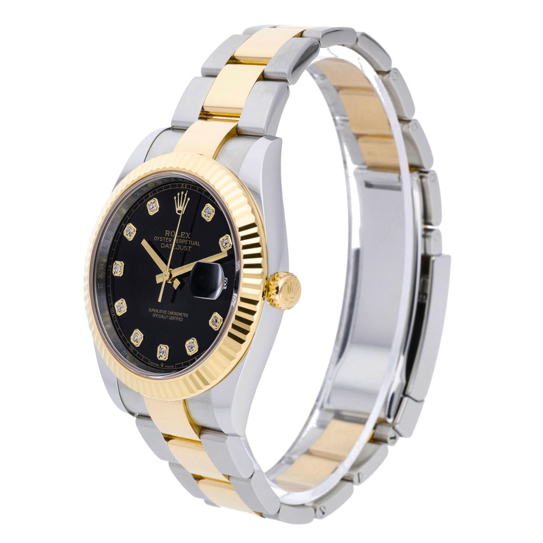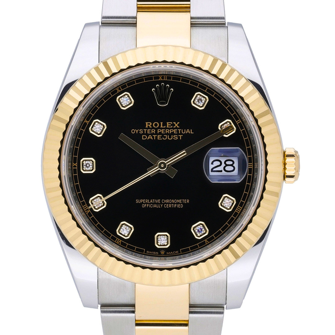 A Rolex Datejust 41 126333 in stainless steel and 18ct yellow gold, featuring the iconic fluted bezel and a striking black dial set with original Rolex diamond hour markers. This configuration perfectly captures the timeless appeal of the Datejust while adding an elevated sense of luxury through its diamond detailing and two-tone construction.