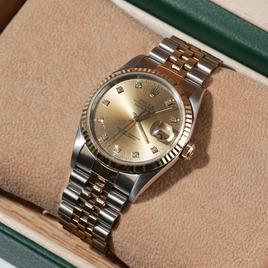 A Rolex Datejust reference 16233 in stainless steel and 18ct yellow gold, featuring the classic fluted bezel and a rich champagne dial set with original Rolex diamond numerals. This configuration captures the essence of the traditional Datejust aesthetic, combining warm tones with a refined, instantly recognisable design.