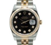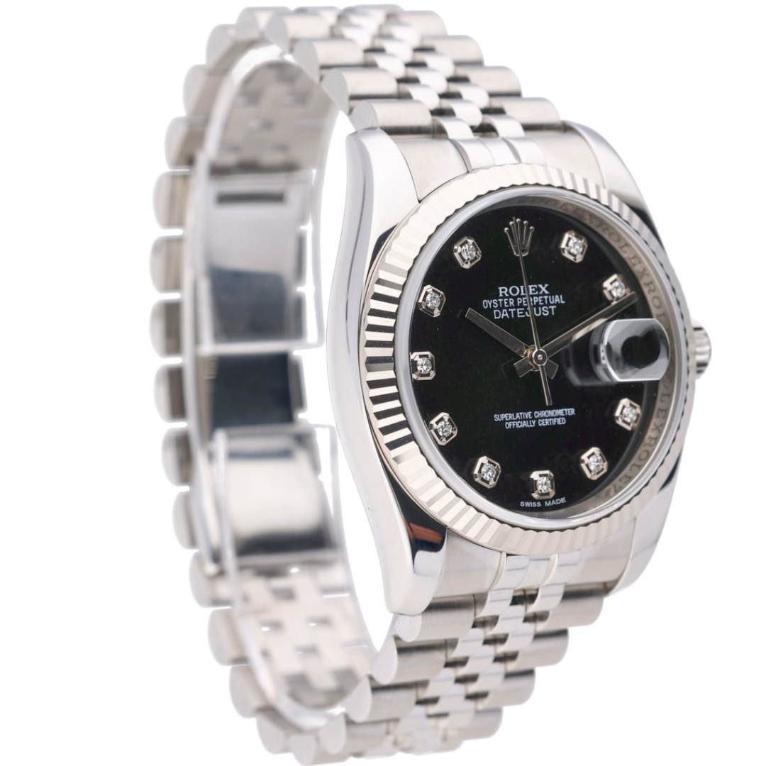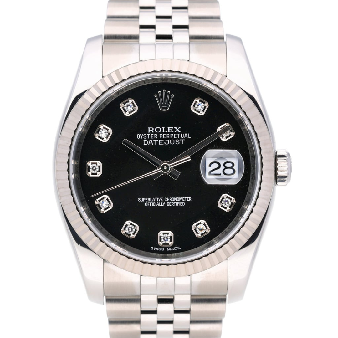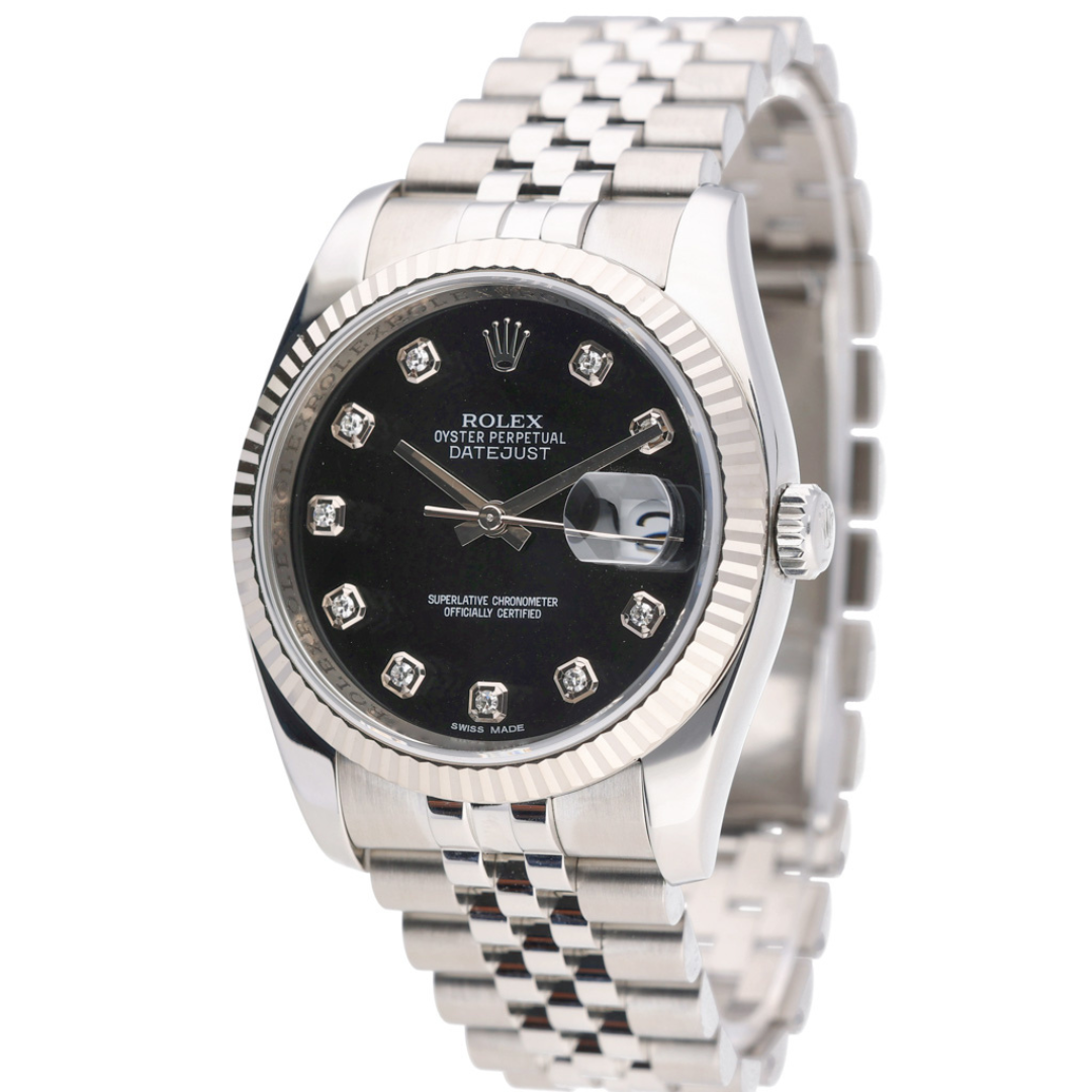 A Rolex Datejust 36 reference 116234 in stainless steel, featuring an 18ct white gold fluted bezel and a black dial set with original Rolex diamond numerals. This configuration offers a refined contrast between the crisp steel case and the depth of the black dial, elevated by the brilliance of factory-set diamonds.