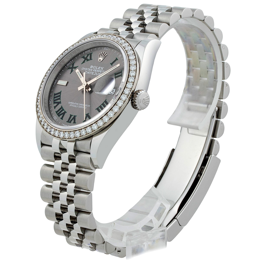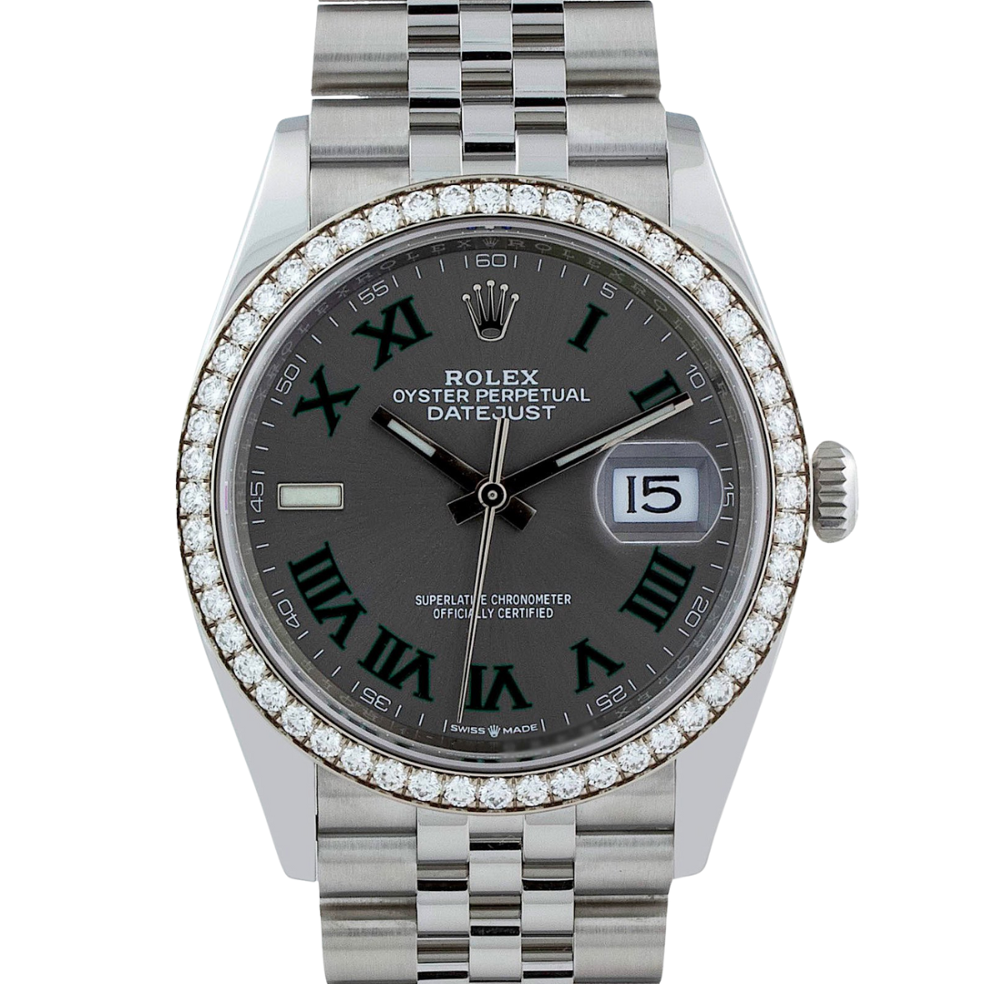 A 2022 example of the Rolex Datejust 36, this reference 126284RBR pairs refined craftsmanship with a striking, contemporary aesthetic. The 36mm stainless-steel case is complemented by an 18ct white-gold diamond-set bezel, offering a sophisticated sparkle that elevates the watch without compromising its versatility. The slate dial is one of the standout configurations in the modern Datejust line, featuring rich tones and contrasting green Roman numerals that give the watch a distinctive and highly desirable look. Paired with the Jubilee bracelet, it delivers exceptional comfort and unmistakable Rolex elegance.