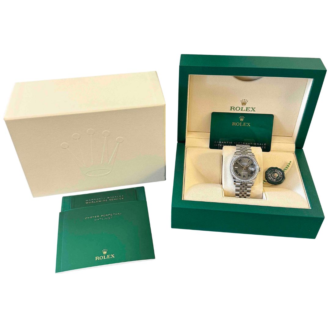 Presented in immaculate condition, this watch comes with its original full set of paperwork and box, along with a Rolex manufacturer's warranty remaining until 2027 for added reassurance. With its diamond bezel, slate dial and modern movement, the 126284RBR stands out as a luxurious yet practical choice, making it an exceptional addition to any collection.