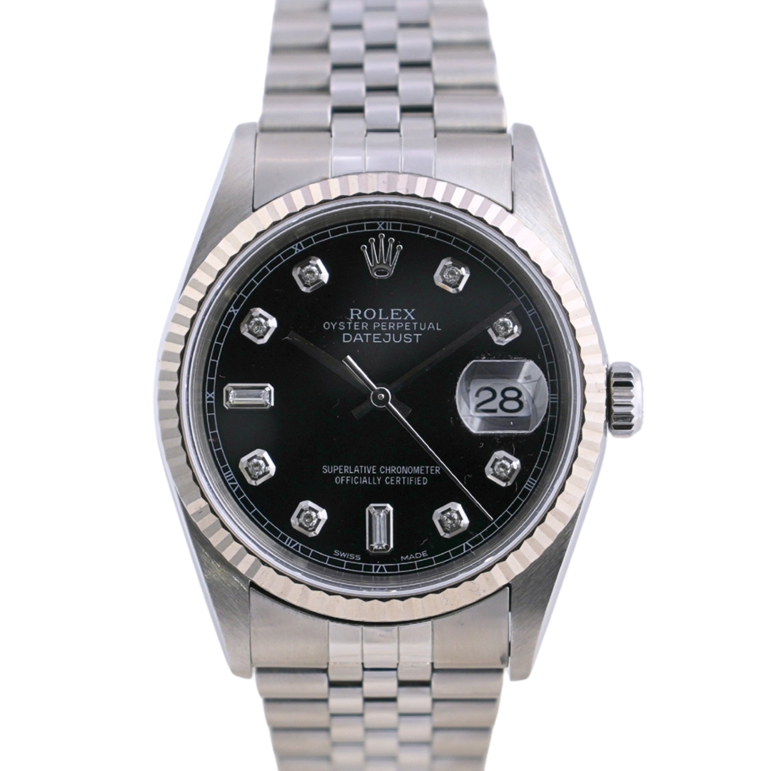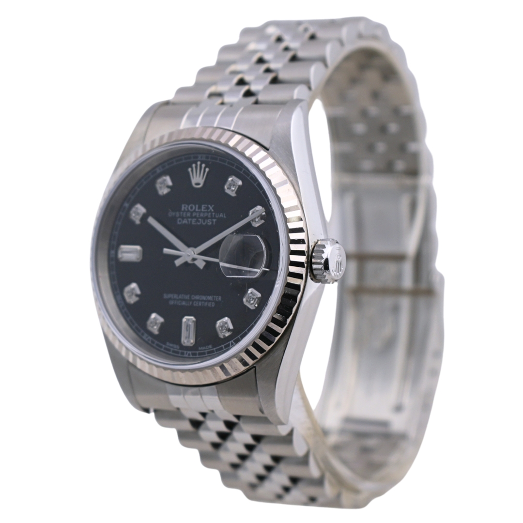 A Rolex Datejust Watch, Stainless Steel with an 18ct White Gold Fluted Bezel and an Afterset Black Dial with Diamond Numerals.