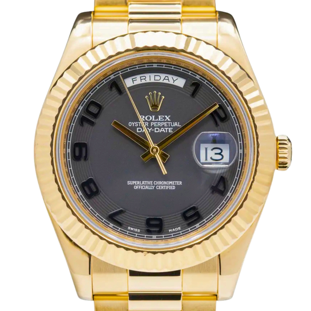 A Rolex Day-Date II, model 218238, is crafted entirely in 18ct yellow gold, delivering unmistakable presence and enduring luxury. The 41mm case is paired with the iconic President bracelet and fluted bezel, creating a design that is both bold and instantly recognisable. The black dial provides striking contrast against the gold case, enhanced by applied Arabic numerals and the signature day-and-date displays, for a distinctive, highly legible layout.