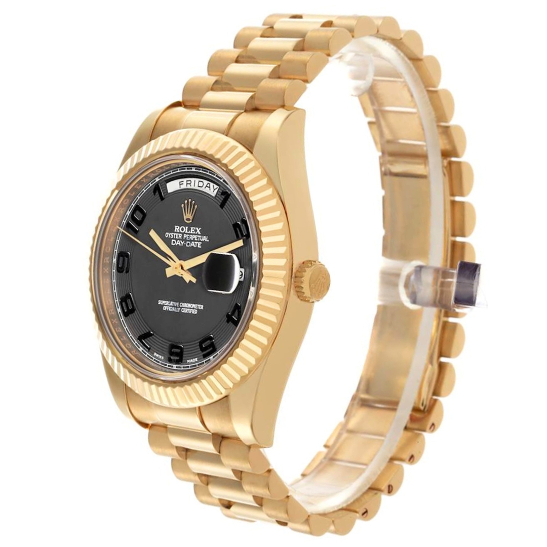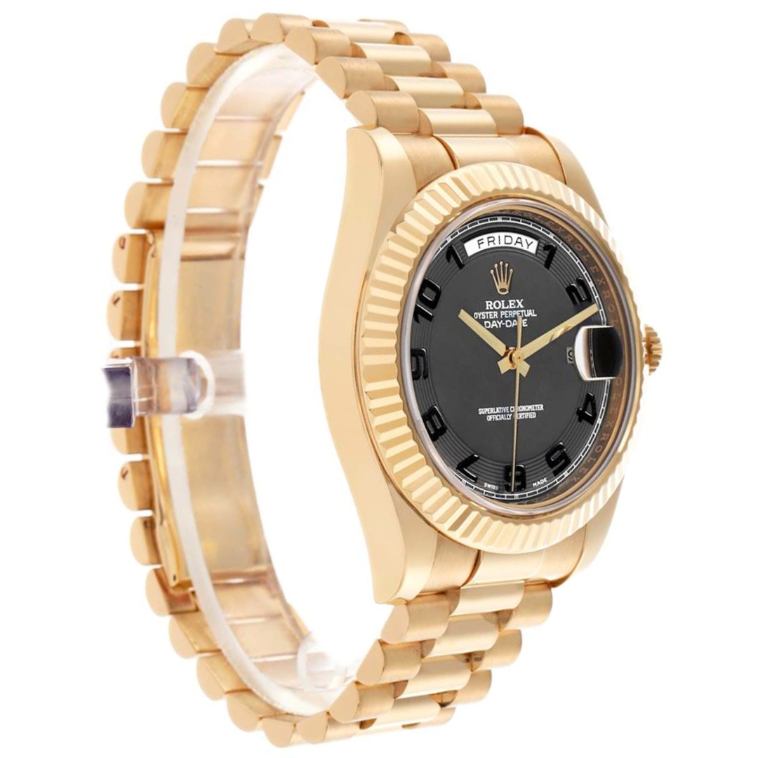 A Rolex Day-Date II Watch, Full 18ct Yellow Gold with a Yellow Gold Fluted Bezel and a Black Dial on a Presidential Bracelet.