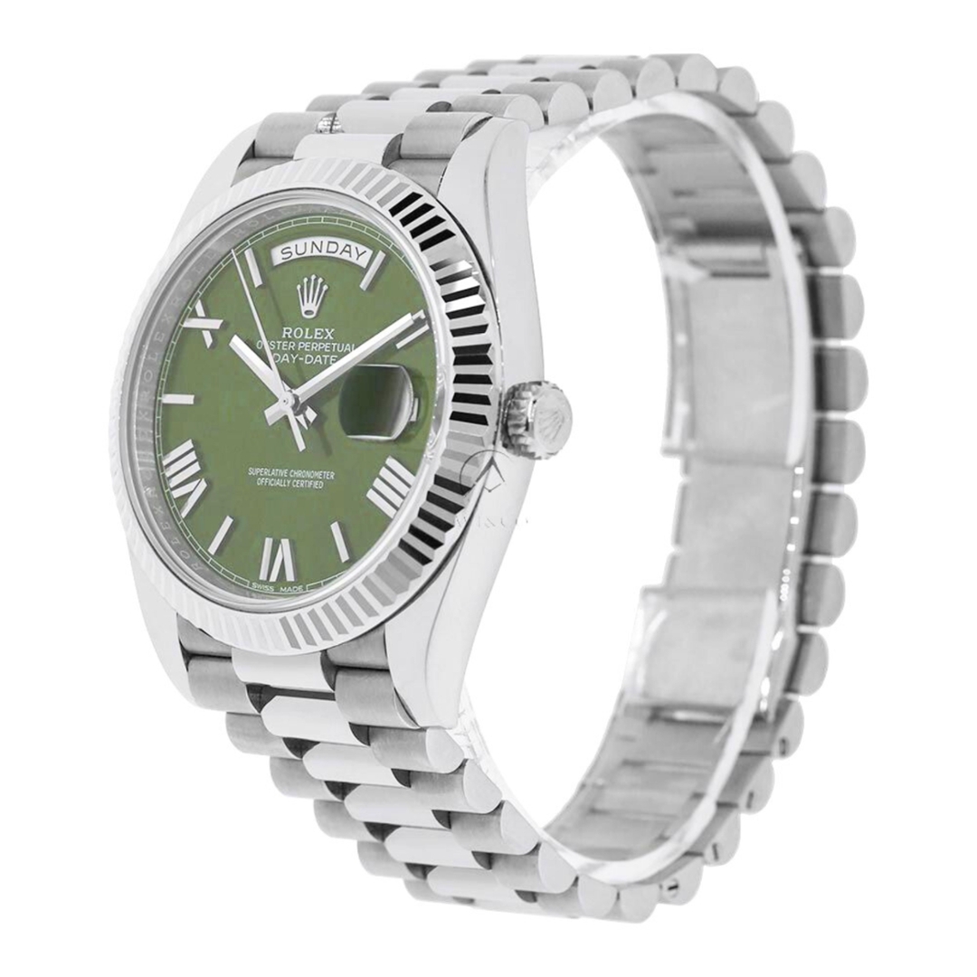 A Rolex Day-Date Watch, Full 18ct White Gold with a White Gold Fluted Bezel and an Olive Green Dial on a Presidential Bracelet.