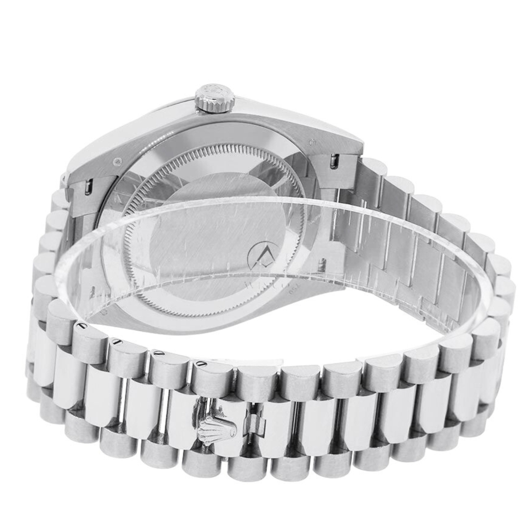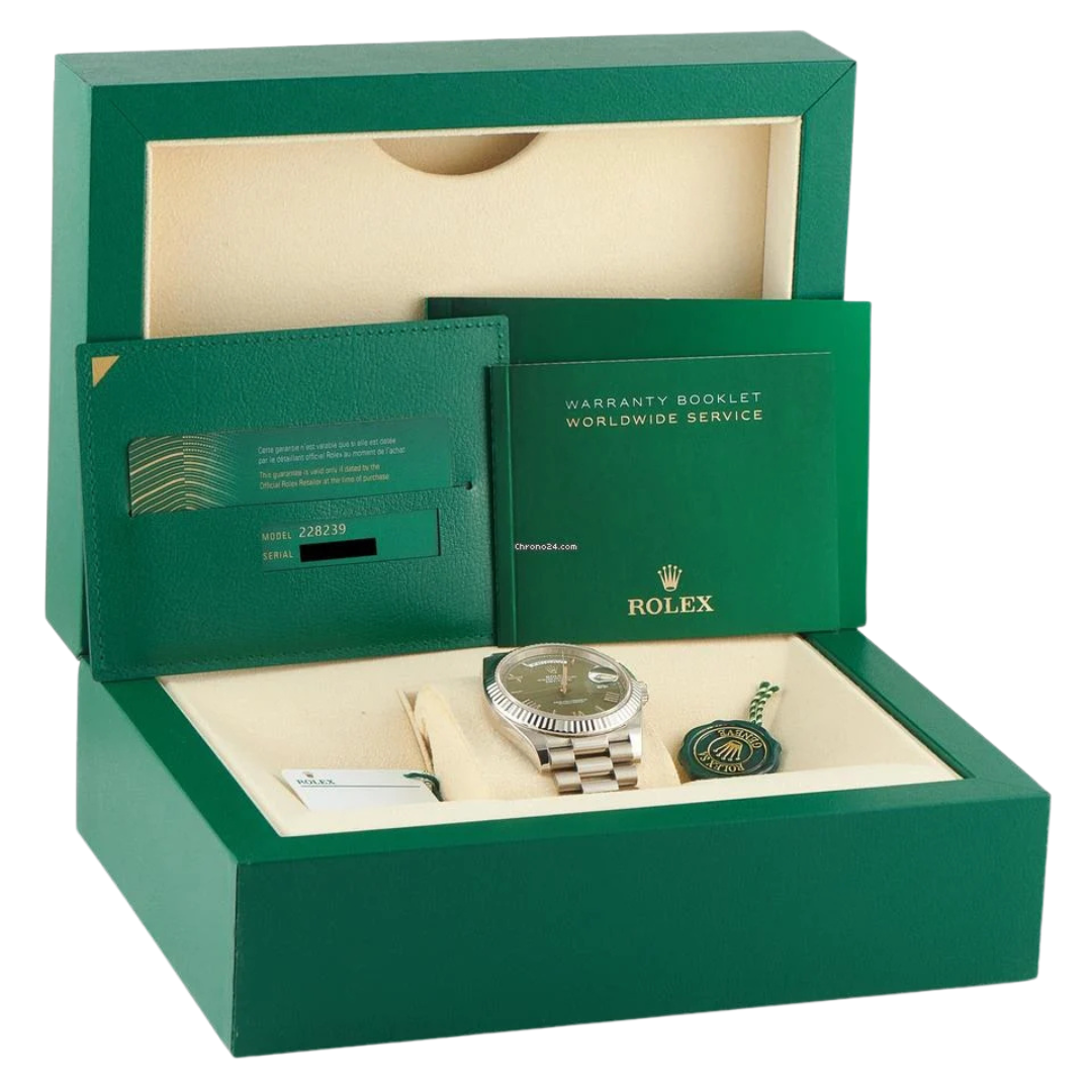 A Rolex Day-Date watch crafted in full 18ct white gold, reference 228239, featuring the iconic white gold fluted bezel and a highly desirable olive green dial. Produced in 2021, this 40mm Day-Date pairs unmistakable presence with refined proportions, sitting confidently on the wrist via the solid President bracelet.
