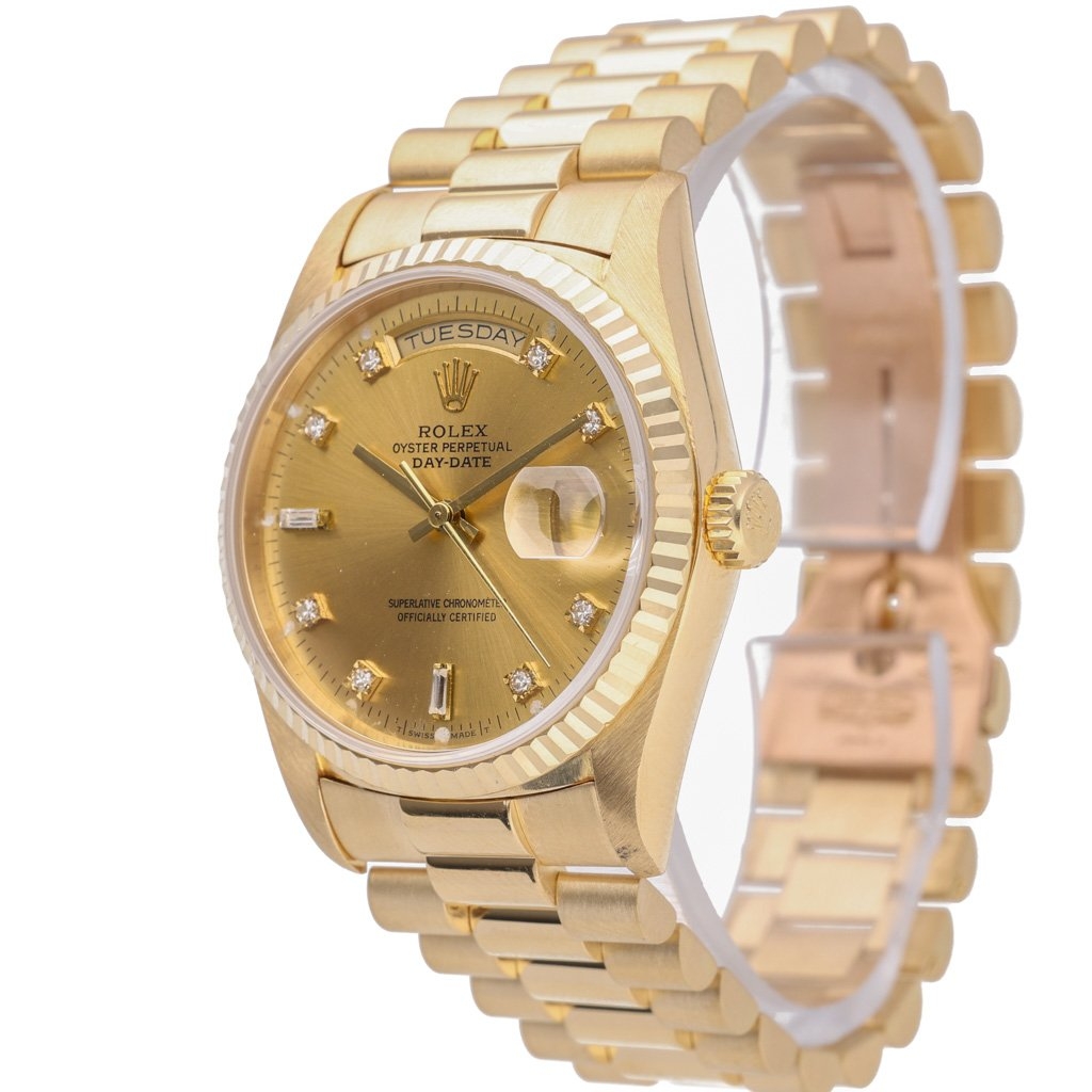 A Rolex Day-Date reference 18238 in full 18ct yellow gold, presented with the iconic champagne dial and original Rolex diamond hour markers. The classic 36mm case is paired with the unmistakable Presidential bracelet and fluted bezel, creating one of the most recognisable and enduring luxury watch designs ever produced. The champagne sunburst dial enhances the warmth of the yellow gold, while factory-set diamond numerals elevate the overall presence with refined brilliance.