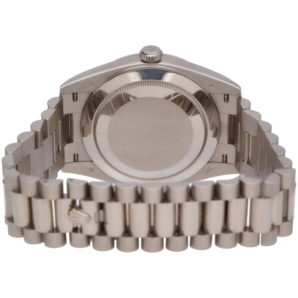 Presented in immaculate condition and dated to 2022, this example is supplied as a full set with original Rolex paperwork and box, and benefits from a Rolex Manufacturer Warranty remaining until 2027. A flagship Day-Date configuration in full white gold, offering strong prestige and consistent demand within the luxury market.