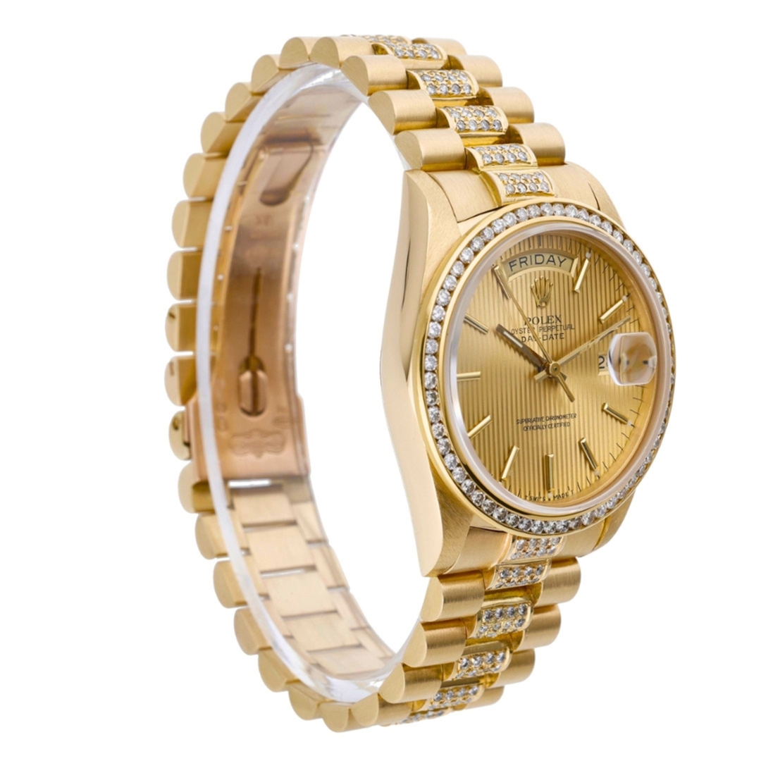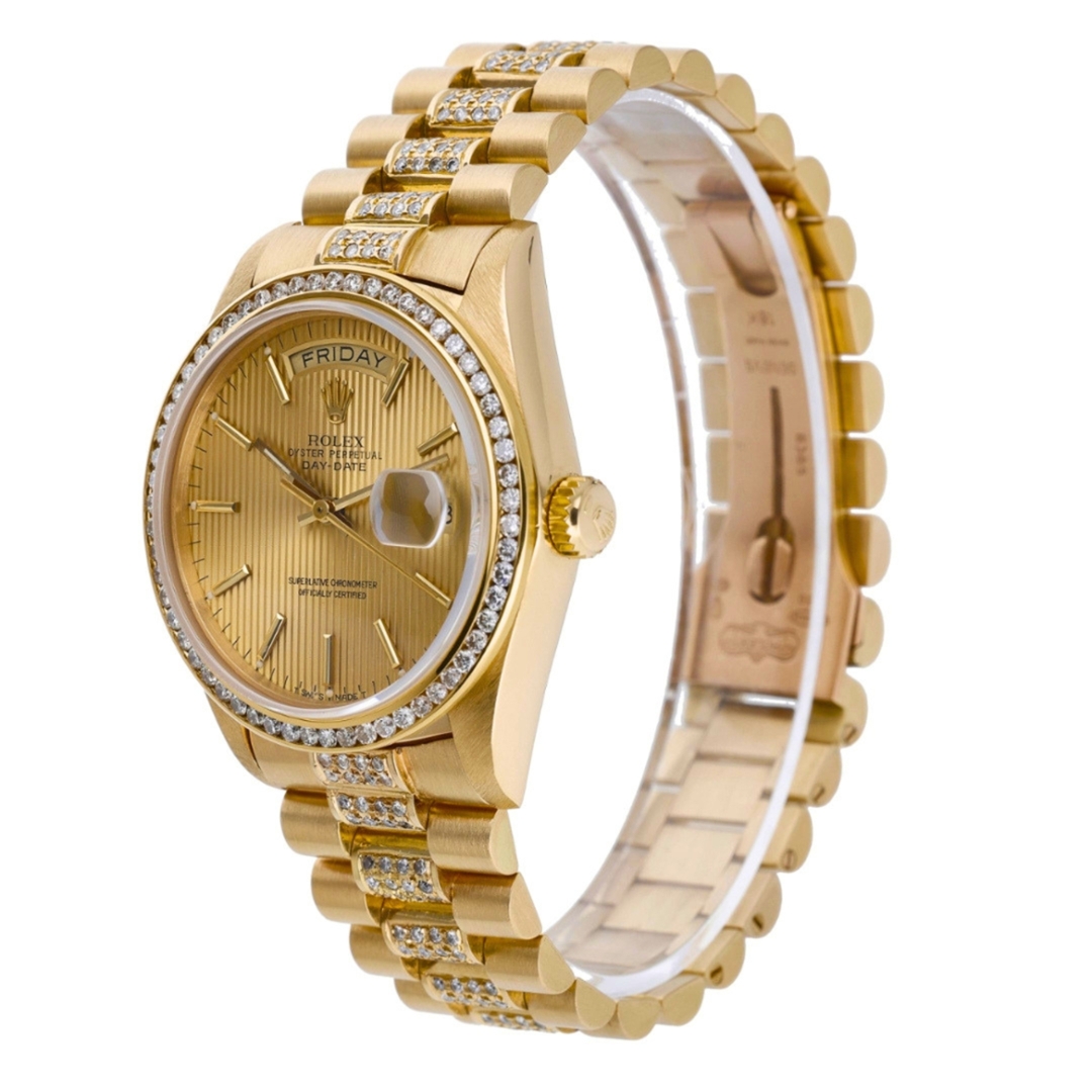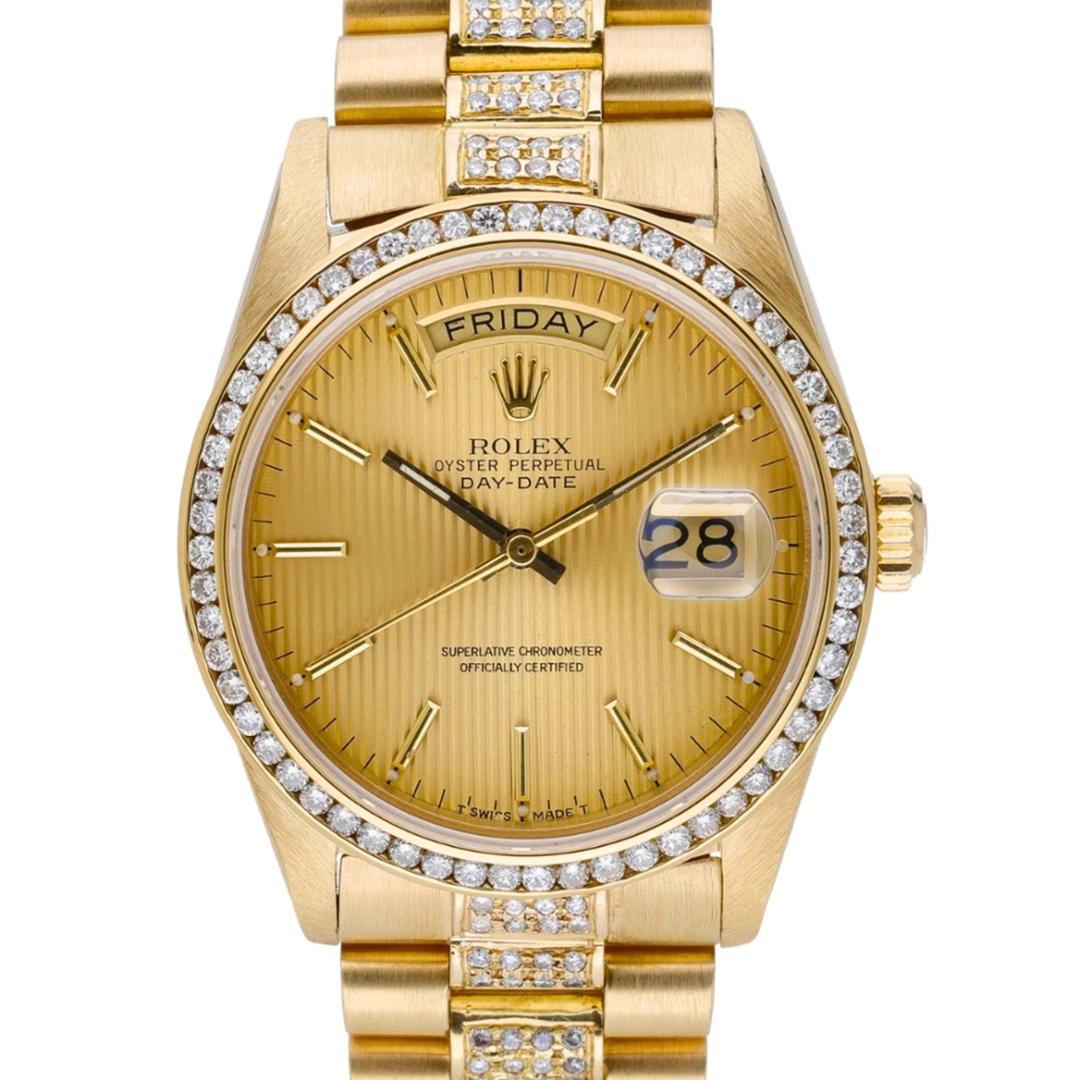 A Rolex Day-Date in full 18ct yellow gold, presented with a striking striped champagne dial and enhanced by an aftermarket diamond-set bezel and bracelet. This iconic configuration marks the evolution of the Day-Date into the sapphire-crystal era, while retaining the classic 36mm proportions and unmistakable presence that have defined the model for decades.