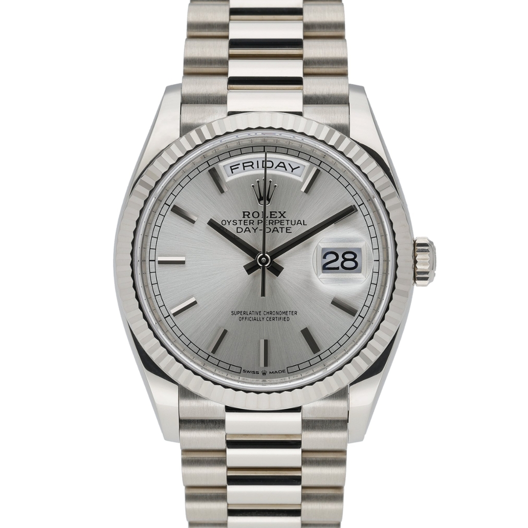 The silver dial enhances the watch’s elegant character, paired with applied hour markers and the distinctive day display at 12 o’clock and date window at 3 o’clock. The fluted white gold bezel and President bracelet complete the look, combining technical excellence with unmatched refinement. Every detail reflects Rolex’s commitment to craftsmanship, from the perfectly balanced dial layout to the mirror-like finish of its precious metal surfaces.