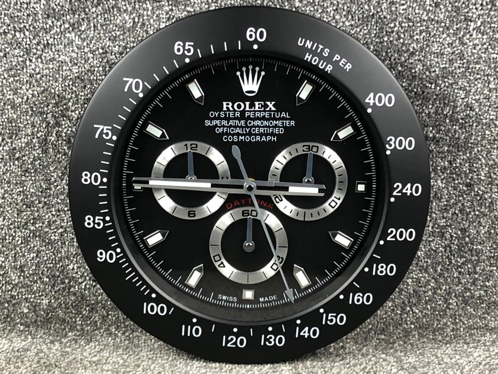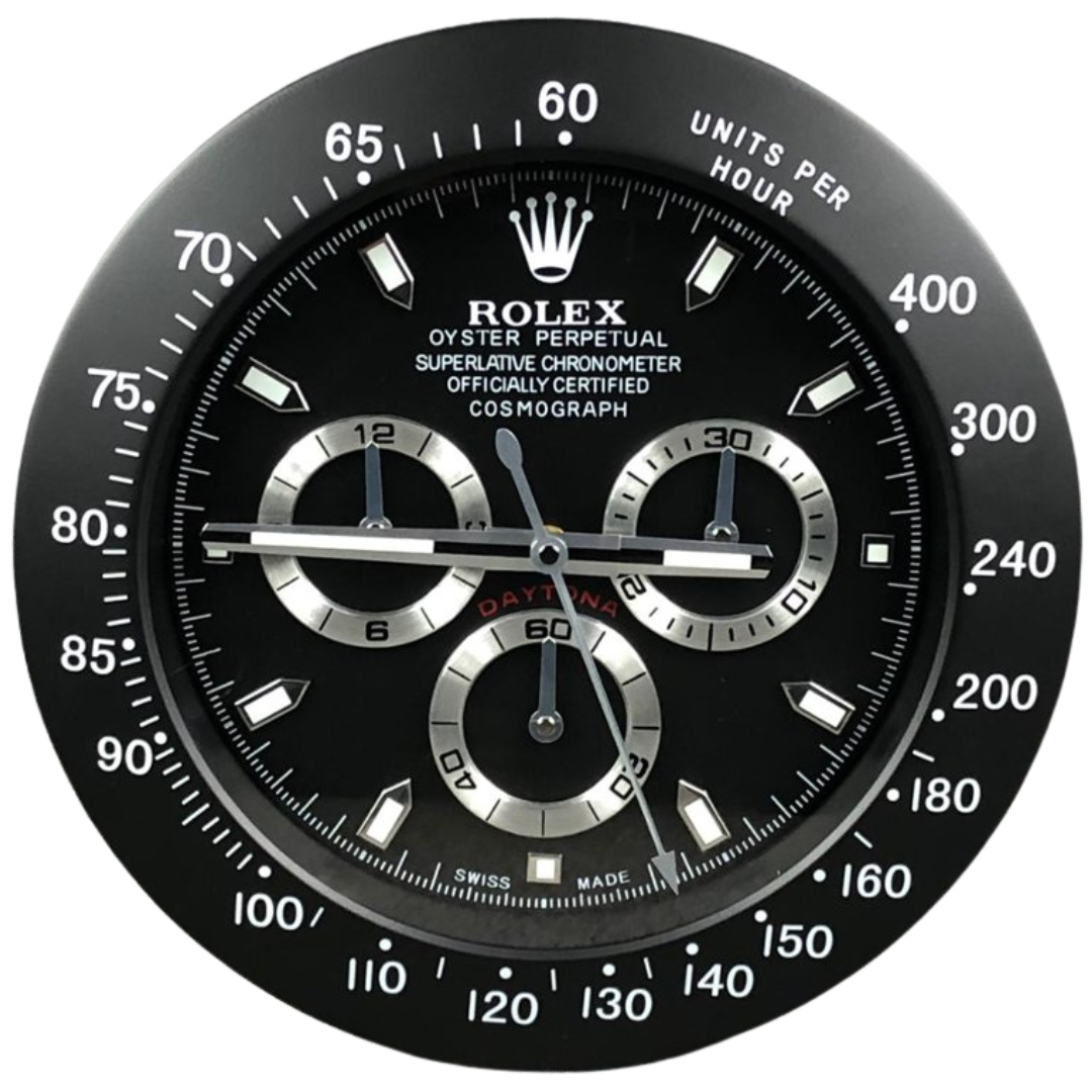 A stainless steel replica Rolex Daytona wall clock, inspired by one of the most celebrated chronographs in watchmaking. Featuring a bold black dial with contrasting silver-tone sub-dials, this piece captures the unmistakable “panda-style” aesthetic that has made the Daytona so iconic. The tachymeter bezel and applied-style hour markers complete the look, delivering a striking and highly recognisable design.