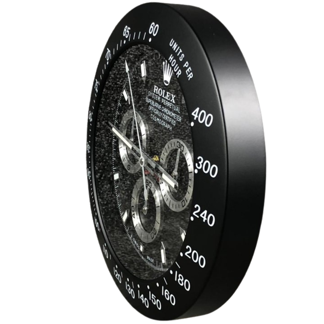A stainless steel replica Rolex Daytona wall clock, inspired by one of the most celebrated chronographs in watchmaking. Featuring a bold black dial with contrasting silver-tone sub-dials, this piece captures the unmistakable “panda-style” aesthetic that has made the Daytona so iconic. The tachymeter bezel and applied-style hour markers complete the look, delivering a striking and highly recognisable design.