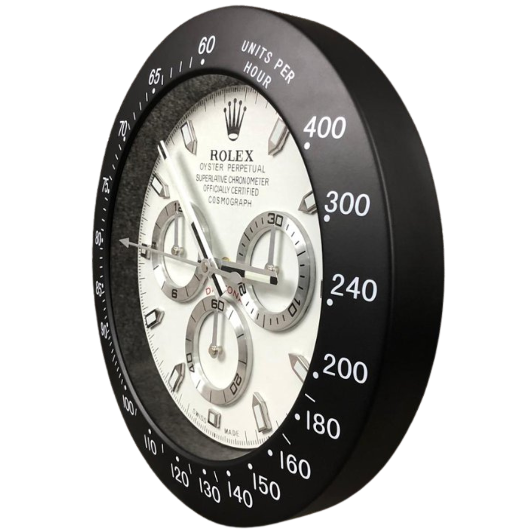 A stainless steel replica Rolex Daytona wall clock, featuring a crisp white dial that delivers a clean and highly sought-after “panda-style” aesthetic. The contrasting black tachymeter bezel frames the dial perfectly, while the applied-style hour markers and silver-tone sub-dials create a sharp, balanced look that is instantly recognisable. The iconic Daytona layout is faithfully represented, offering strong visual presence in a larger format.