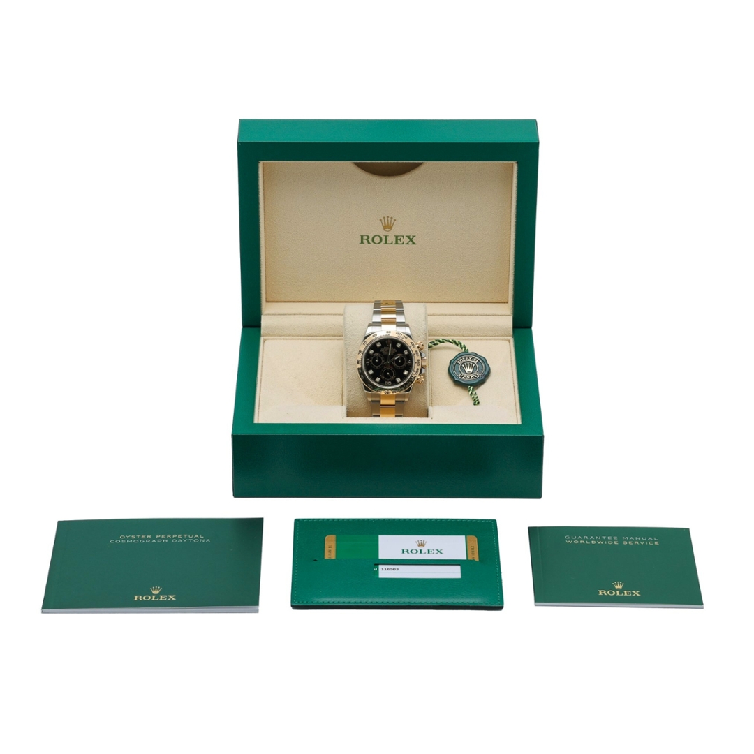 Overall, the Bi-Metal Rolex Daytona 116503 is more than just a timepiece; it is a statement of style and precision engineering, offering timeless appeal and dependable performance. Its blend of stainless steel, 18ct yellow gold, and diamond elements, combined with impeccable condition and comprehensive documentation, makes it a coveted addition to any luxury watch collection.
