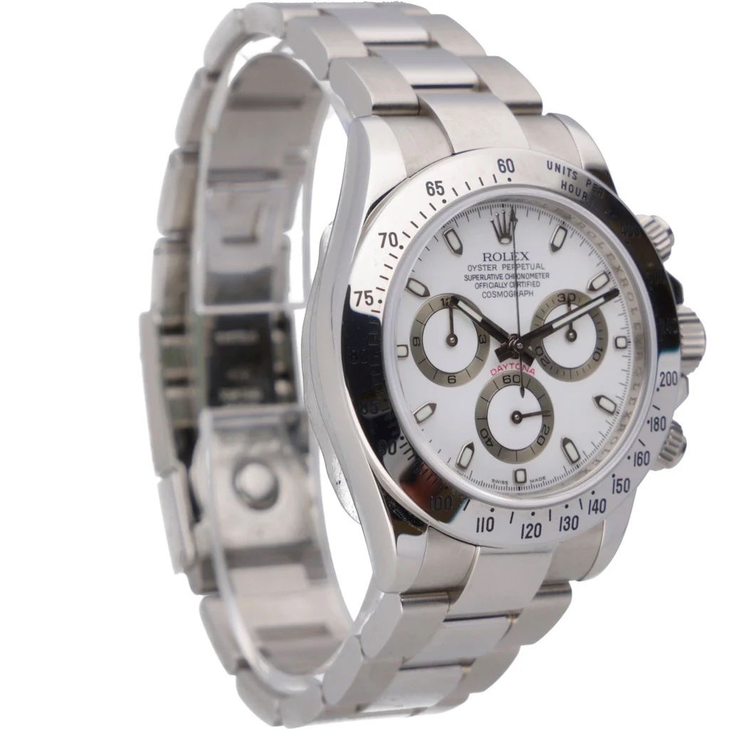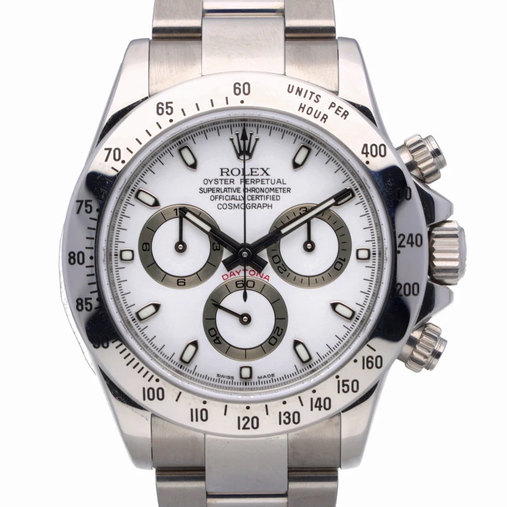 A Rolex Daytona Watch, Stainless Steel on a White Dial