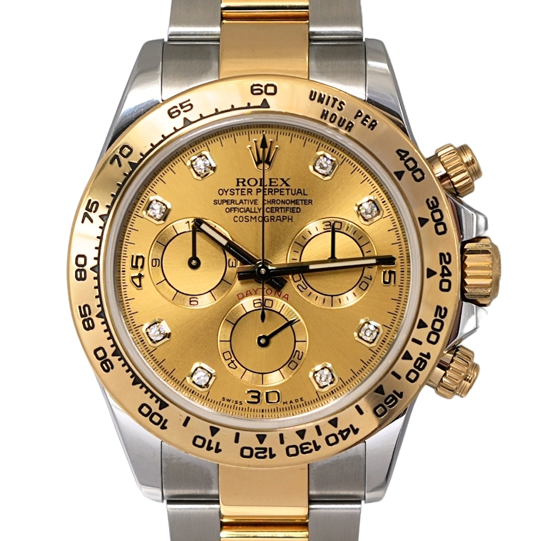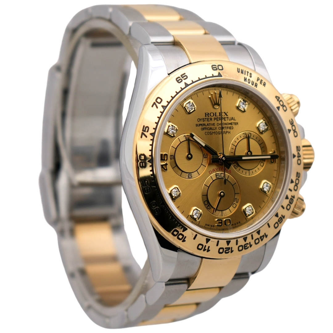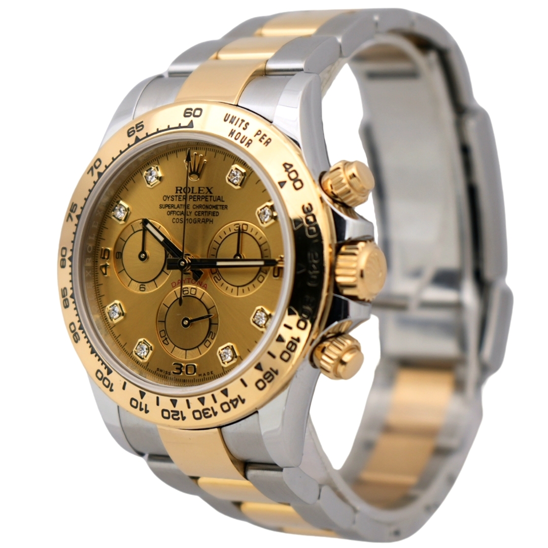This Rolex Daytona 116503 represents one of the most recognisable and liquid chronographs in the modern luxury market. Crafted in stainless steel and 18ct yellow gold, it features the iconic champagne dial set with original Rolex diamond hour markers, paired with the fixed yellow gold tachymeter bezel that defines the Daytona lineage.