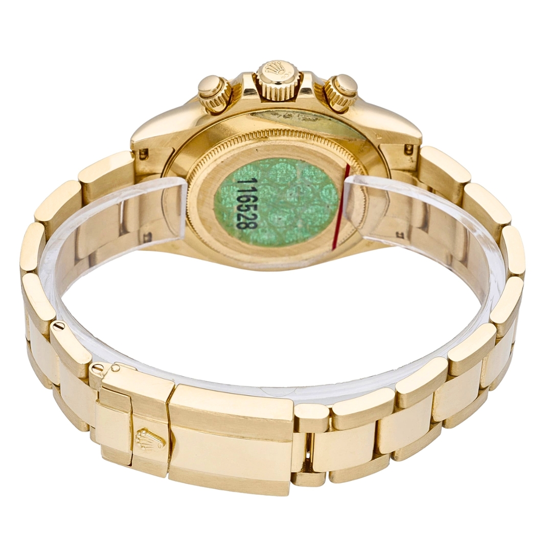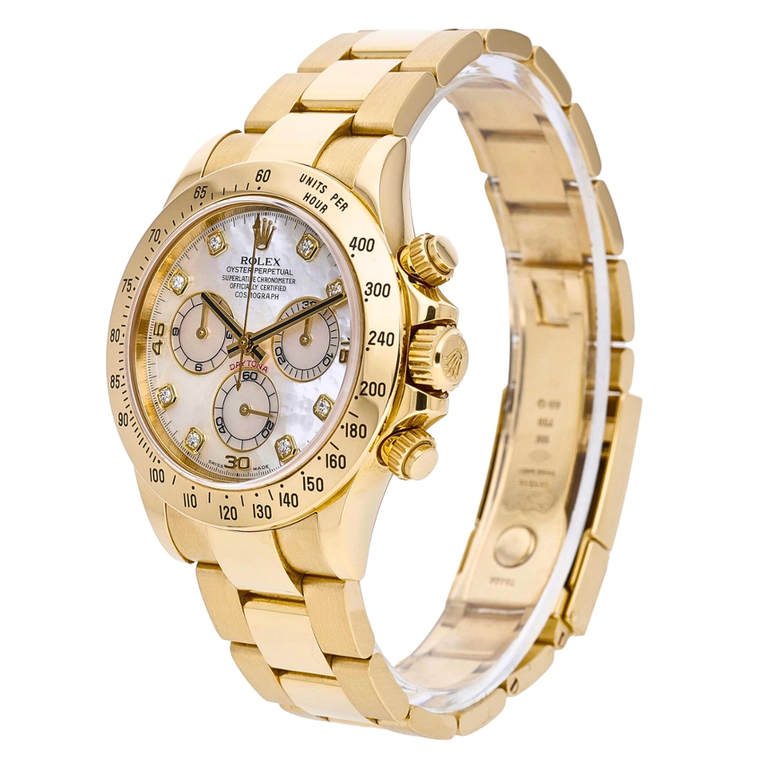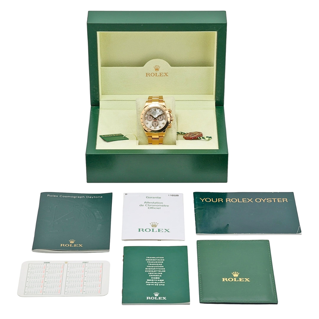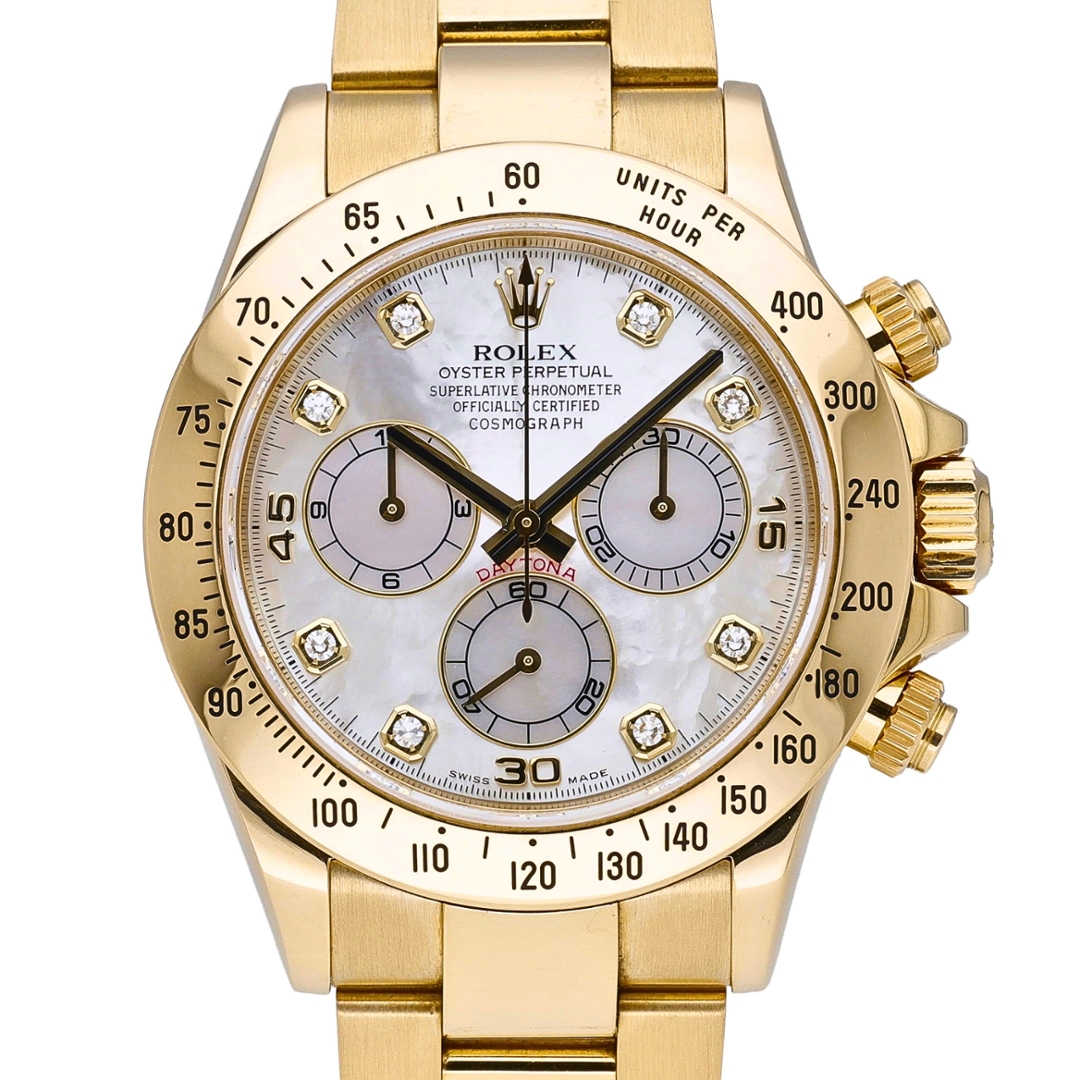 A Rolex Daytona Watch in full 18ct yellow gold, presented in immaculate condition, showcasing one of the most luxurious variations of this iconic chronograph. The 40mm case is complemented by a matching Oyster bracelet, delivering a bold yet refined presence on the wrist. The standout feature is the mother-of-pearl dial, enhanced with original Rolex diamond-set hour markers, offering a subtle iridescence that shifts beautifully under changing light while maintaining the classic Daytona layout.