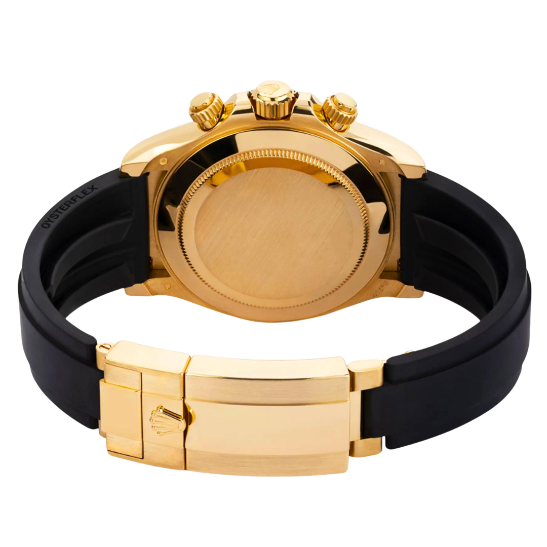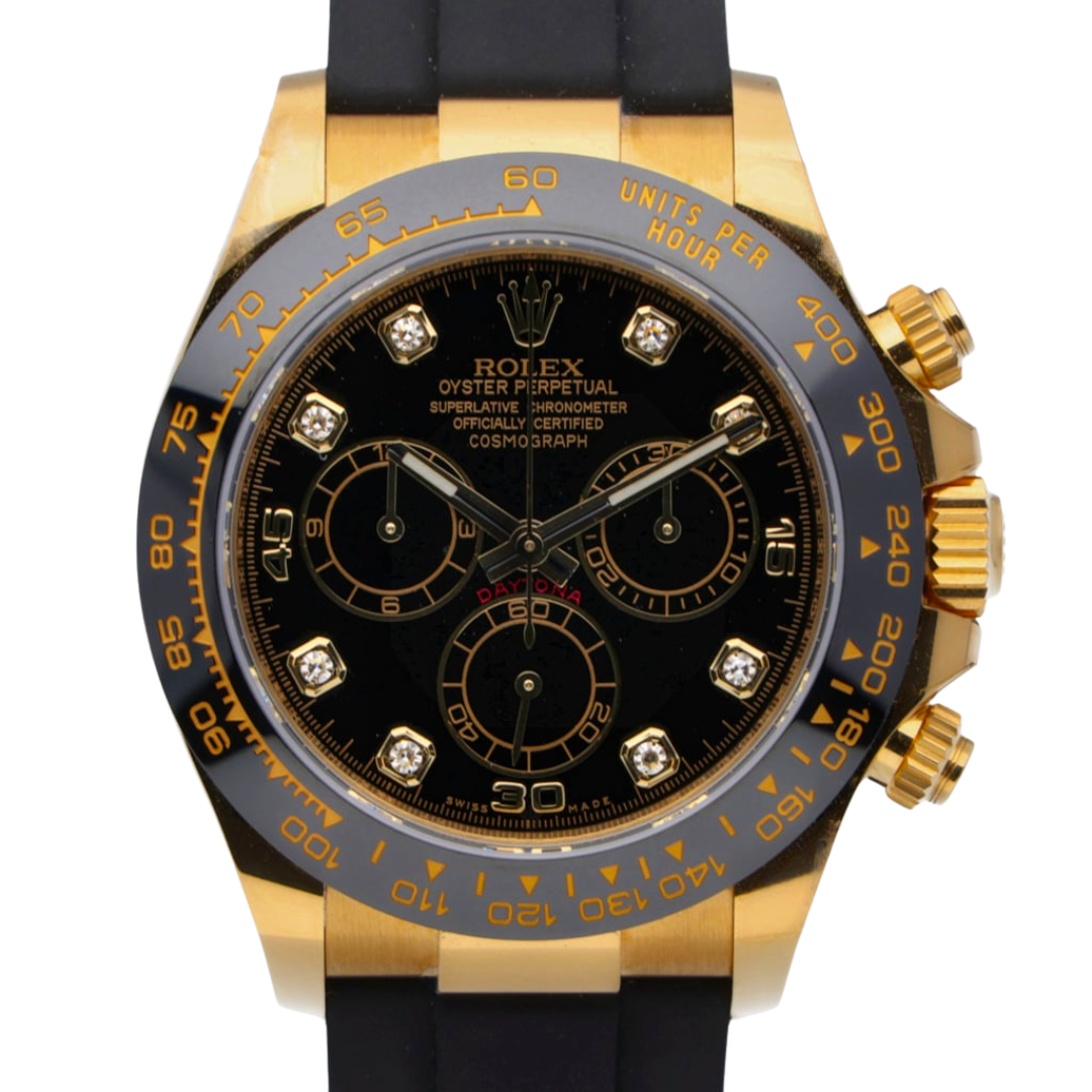 A Rolex Daytona Watch, 18ct Yellow Gold Case & Clasp with a Black Rubber Strap and a Black Bezel on a Black Dial with Diamond Numerals.