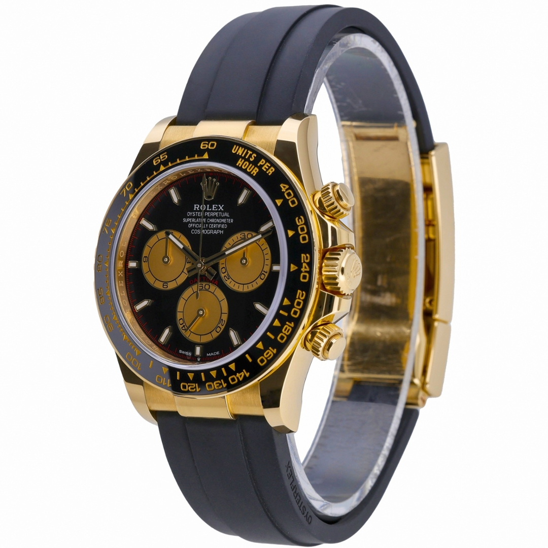 A Rolex Cosmograph Daytona reference 126518LN in 18ct yellow gold, fitted with a black Oysterflex rubber strap and a black Cerachrom tachymeter bezel, presented as a complete full set with the Rolex manufacturer's warranty remaining until 2030. The 40mm yellow-gold case delivers a strong wrist presence, while the black dial with contrasting gold-ringed sub-dials and red Daytona script maintains the model’s unmistakable racing identity.