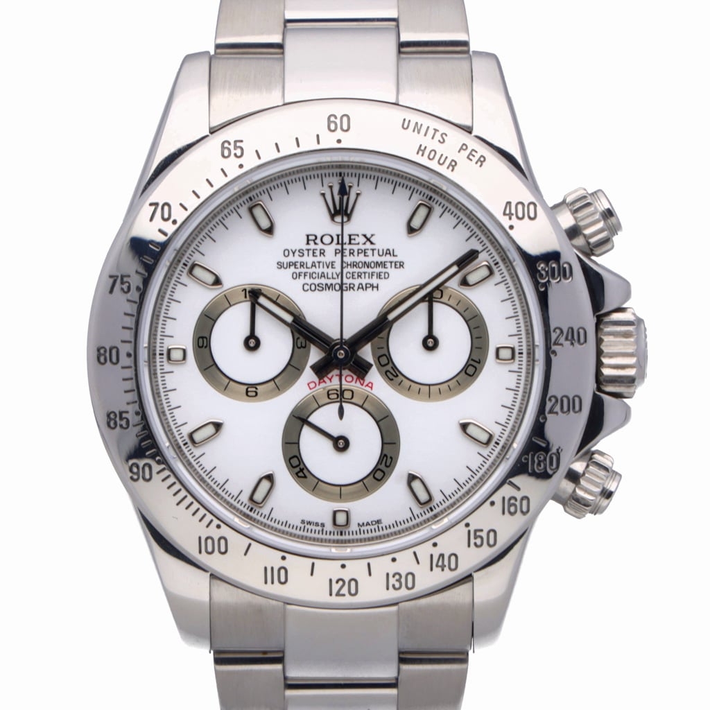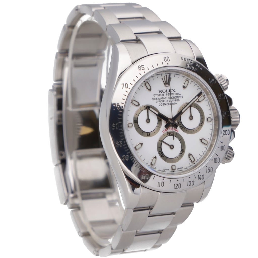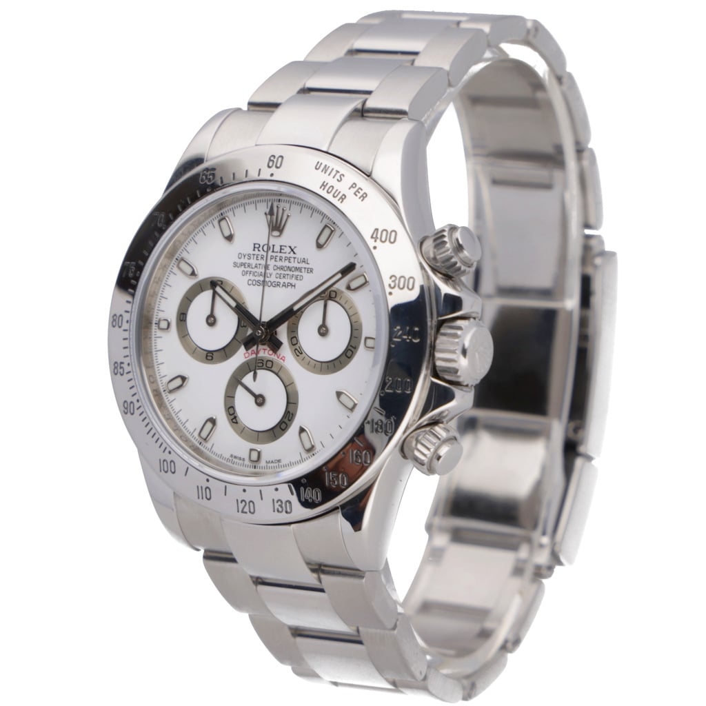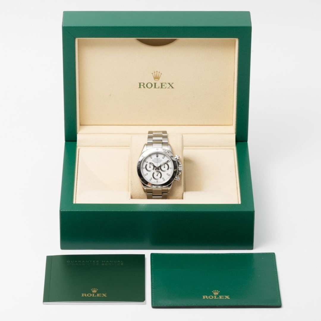 A Rolex Daytona reference 116520, presented in stainless steel with the sought-after white dial, often referred to as the “panda” configuration. This model represents the final generation of the Daytona before the introduction of the ceramic bezel, giving it a unique position in the evolution of one of Rolex’s most iconic chronographs.
