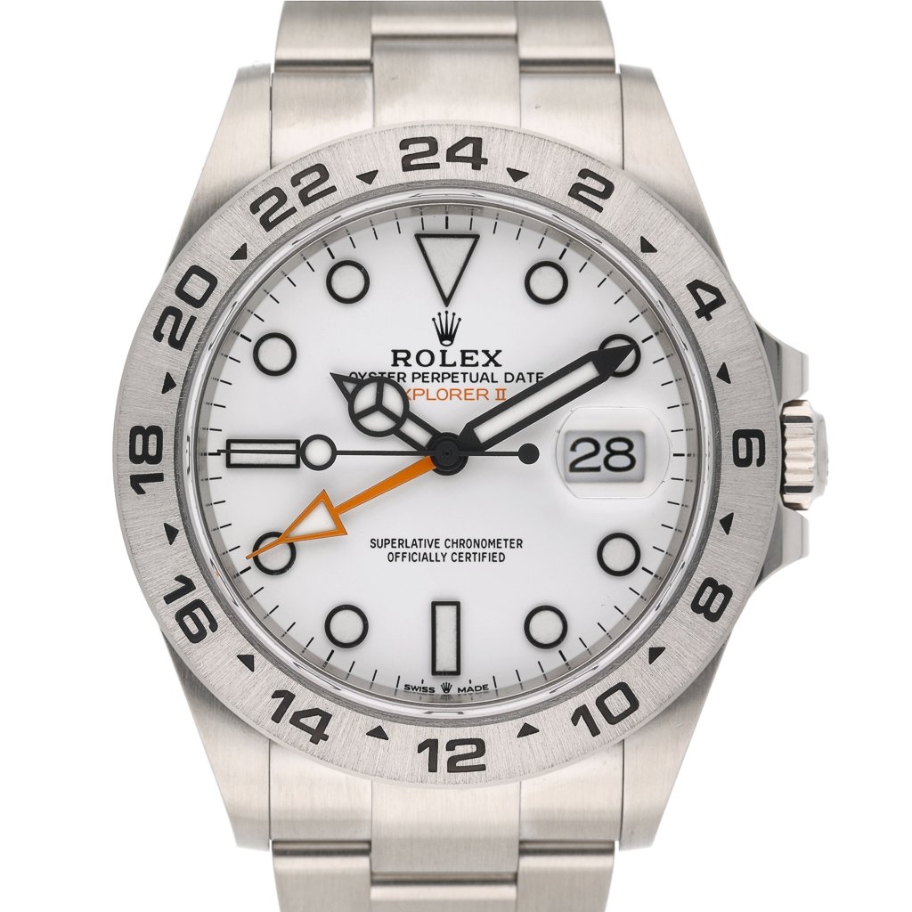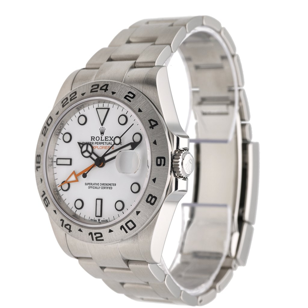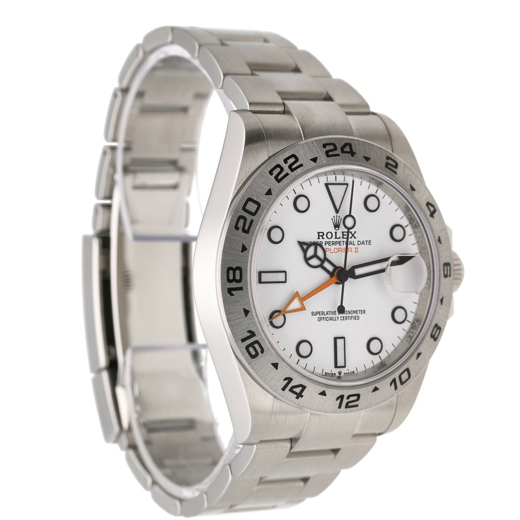 A Rolex Explorer II 226570 is a robust, versatile timepiece designed for adventurers and watch enthusiasts alike. Crafted from durable stainless steel, its 42mm case offers a commanding presence while maintaining a sleek and wearable profile. The crisp white dial, often called the "Polar" dial, features bold black hour markers and hands filled with Chromalight for exceptional legibility in low-light conditions. The signature 24-hour orange GMT hand and fixed bezel allow tracking a second-time zone.
