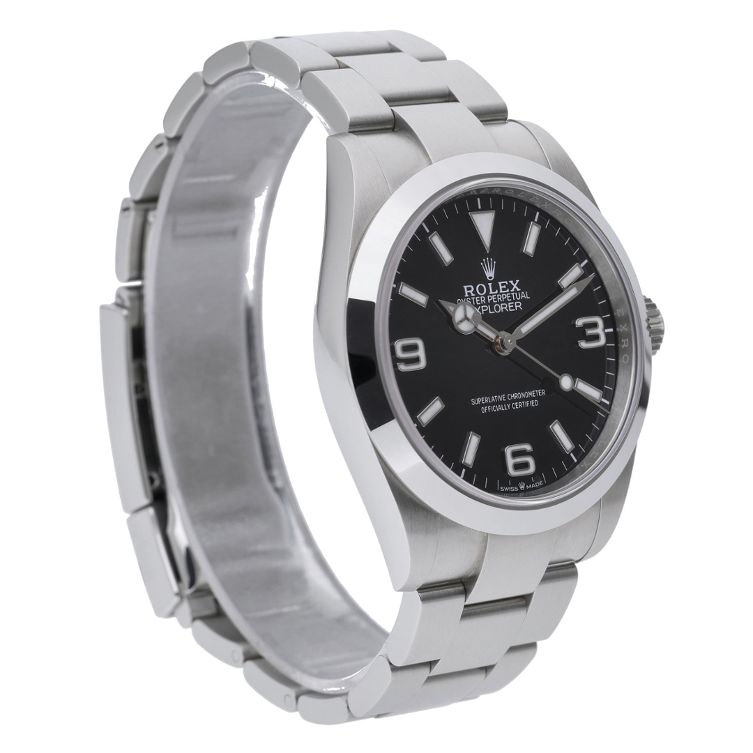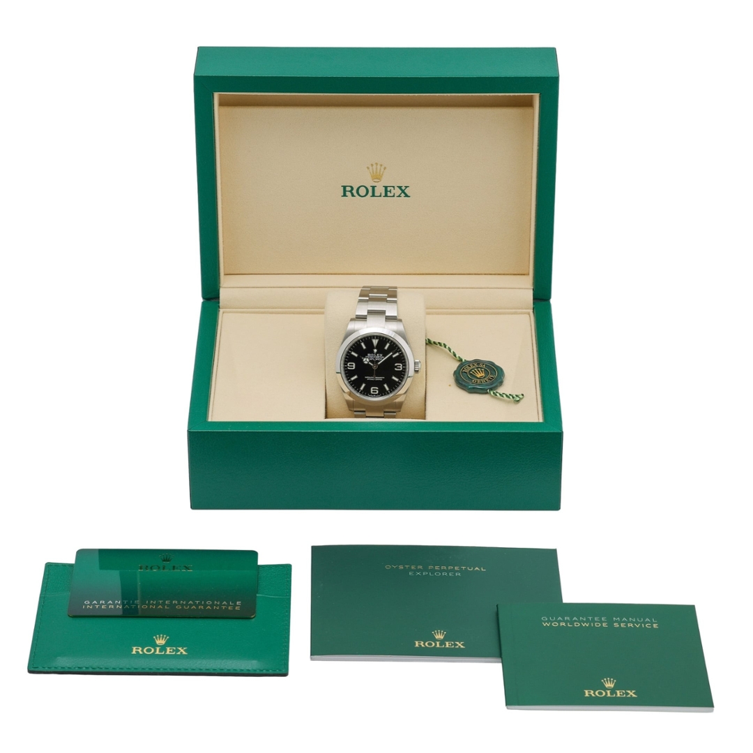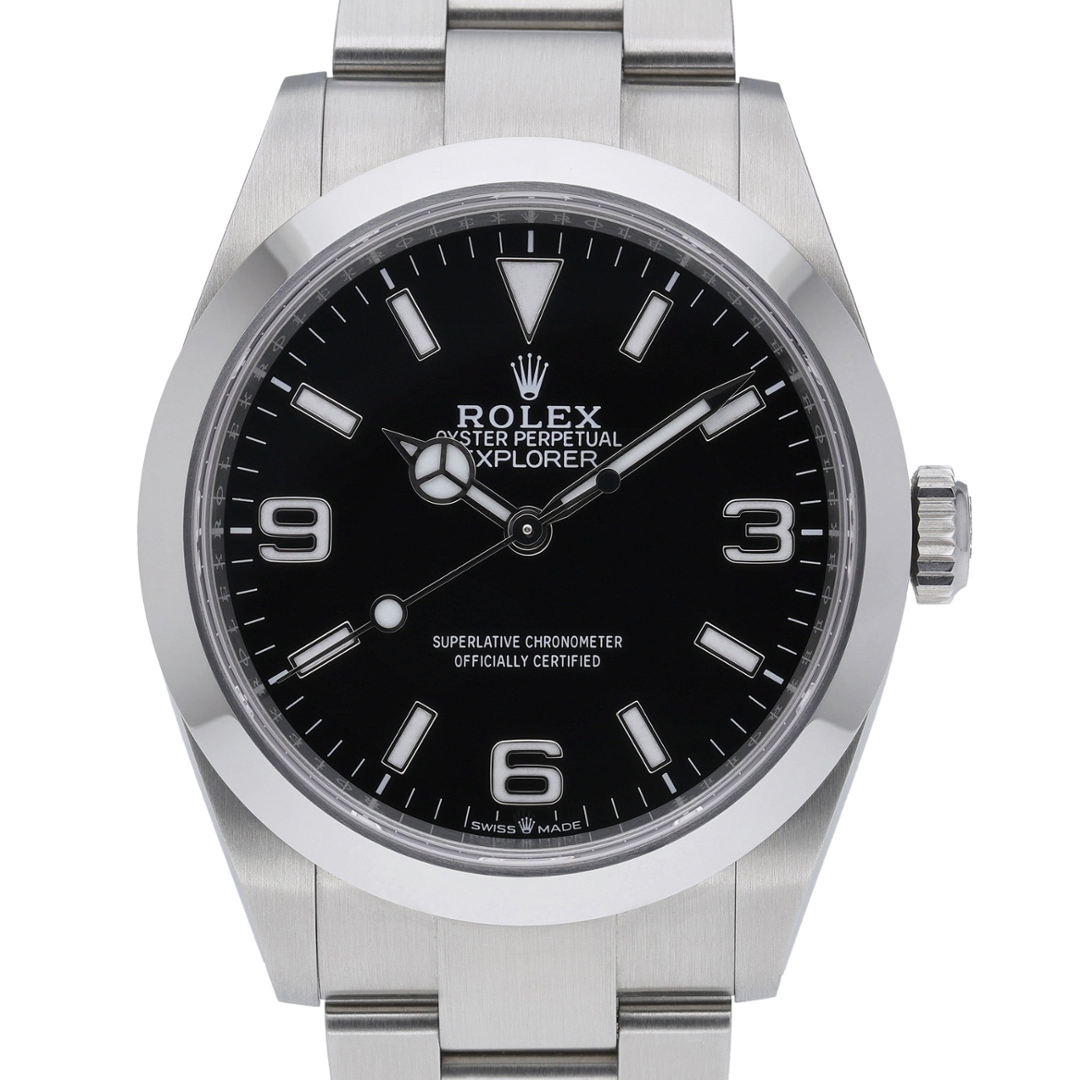 A Rolex Explorer Watch in stainless steel, featuring the classic black dial that defines one of Rolex’s most enduring professional models. The 40mm Oyster case offers a balanced and highly wearable profile, combining robust construction with understated design. The signature Arabic numerals 3, 6, and 9, luminous hour markers, and Mercedes hands provide exceptional legibility, staying true to the Explorer’s heritage as a watch built for clarity and reliability in challenging environments.
