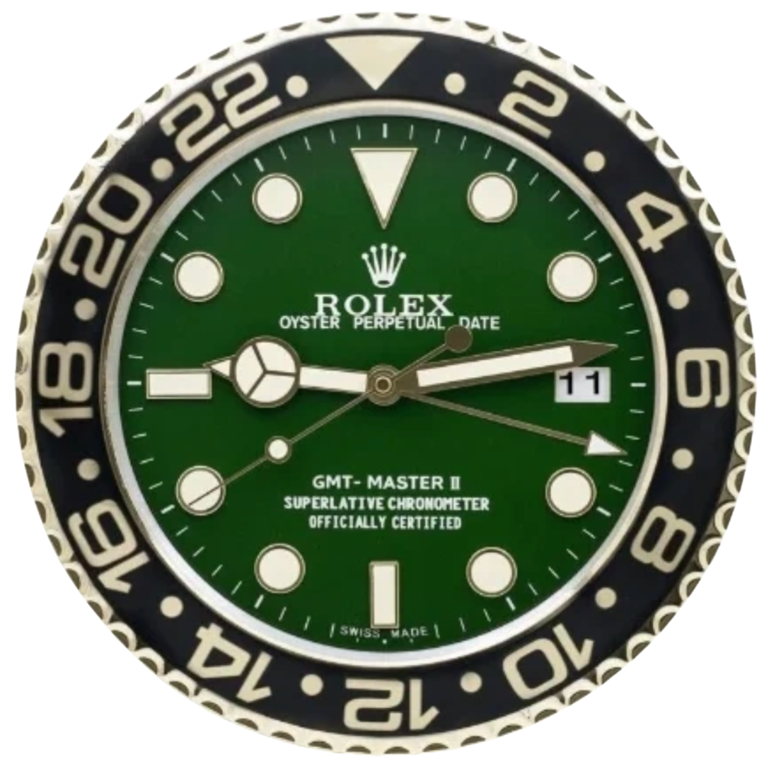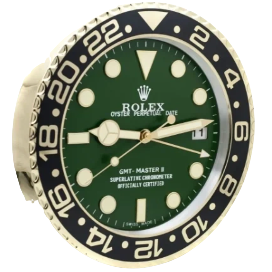 A stainless steel replica Rolex GMT Gold & Green Wall Clock, inspired by the unmistakable design language of the GMT-Master II, presents a bold and eye-catching display. The rich green dial is paired with luminous-style hour markers and signature Mercedes hands, framed by a black and gold 24-hour bezel that captures the essence of the original travel watch aesthetic.