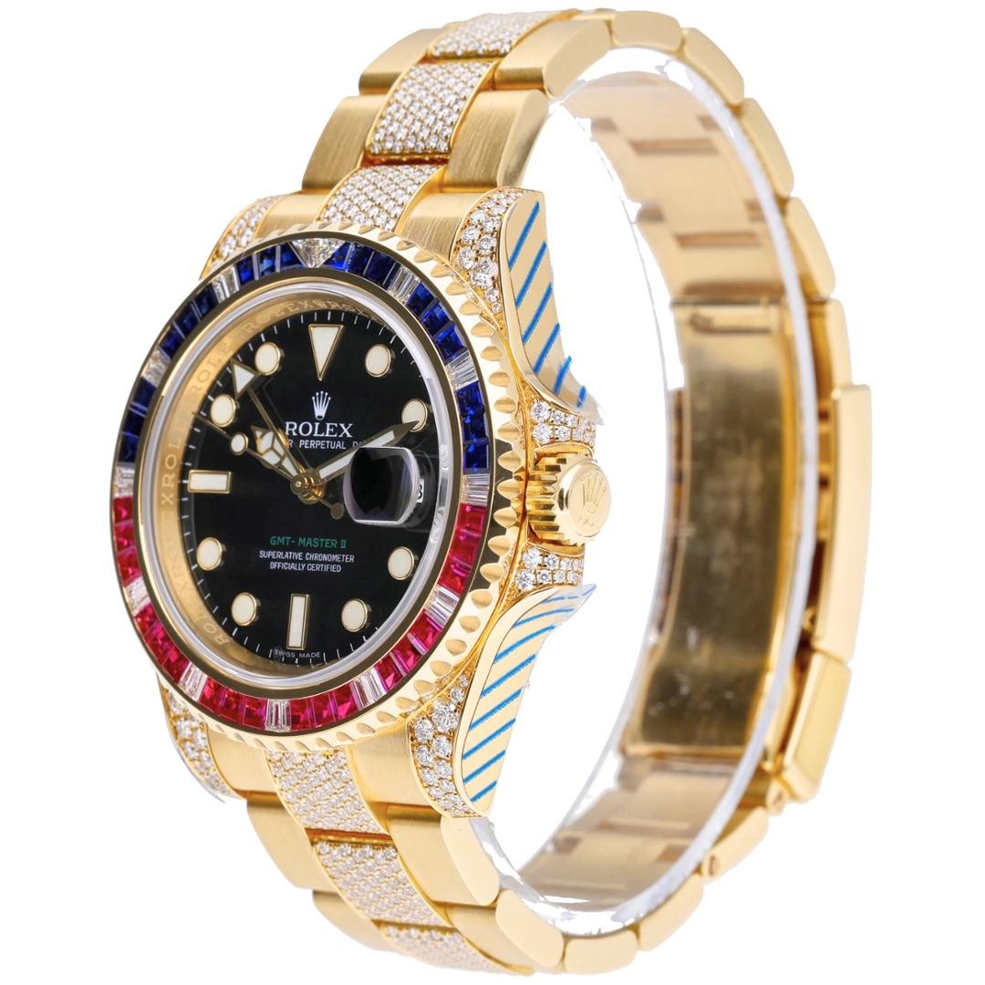 A Rolex GMT-Master II Watch in 18ct yellow gold, elevated by one of the most striking factory-set configurations in the Rolex catalogue. The 40mm Oyster case is paired with a matching gold bracelet, while the black dial delivers a sharp contrast against the vivid bezel set with sapphires, diamonds and rubies. Diamond-set centre links and shoulders add even greater visual impact.