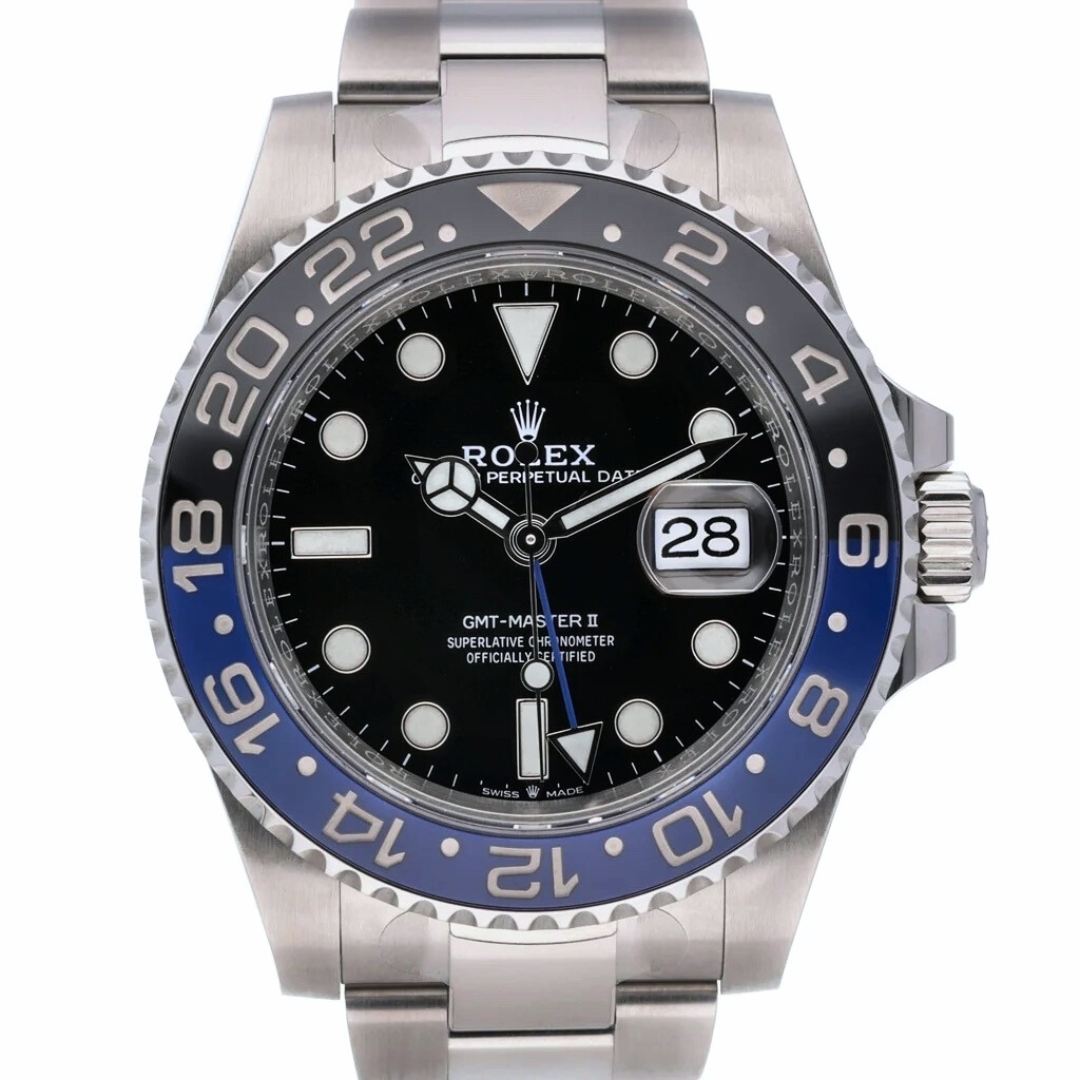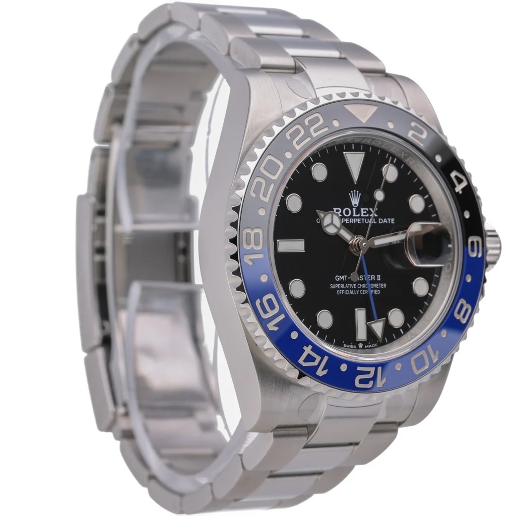 A Rolex GMT-Master II 126710BLNR with an Oyster bracelet, also known as the "Batman" due to its striking black-and-blue bezel, is a sophisticated, versatile timepiece that seamlessly blends luxury with functionality. Introduced in 2023, this watch boasts a 40mm stainless steel case that exudes durability and elegance, making it suitable for casual and formal occasions.