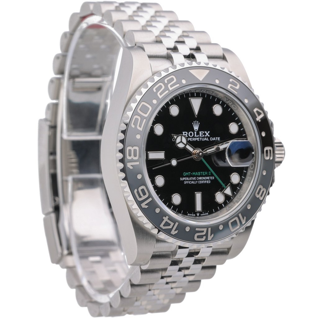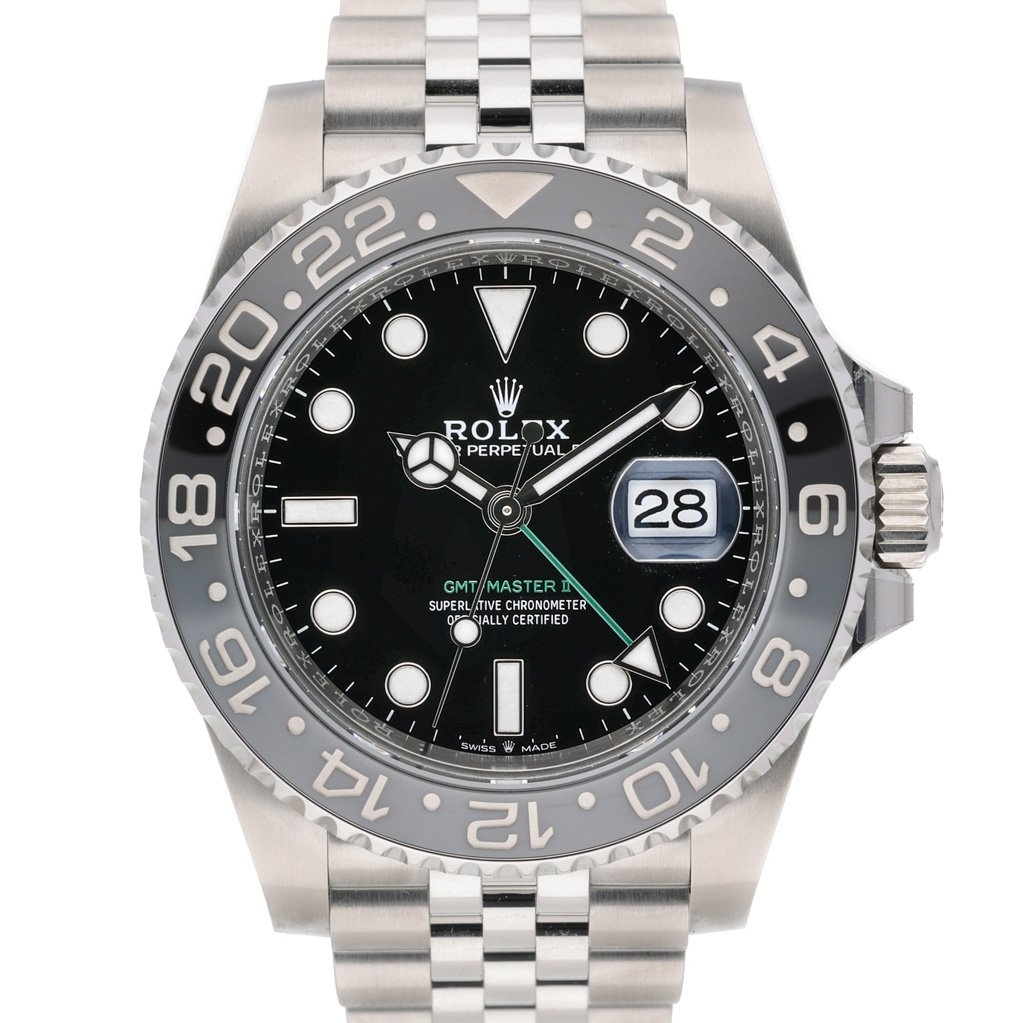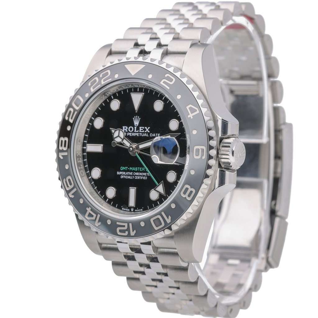 A Rolex GMT-Master II 126710GRNR, crafted in stainless steel and featuring the newly introduced black and grey Cerachrom bezel — a sleek, modern evolution of the GMT line. Paired with a classic black dial and luminous hour markers, this 40mm model delivers understated elegance with unmistakable Rolex presence.