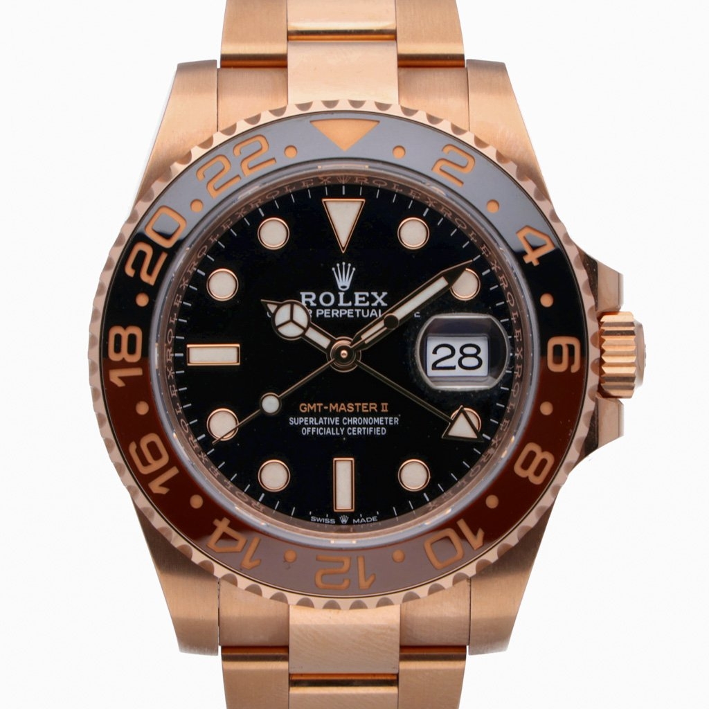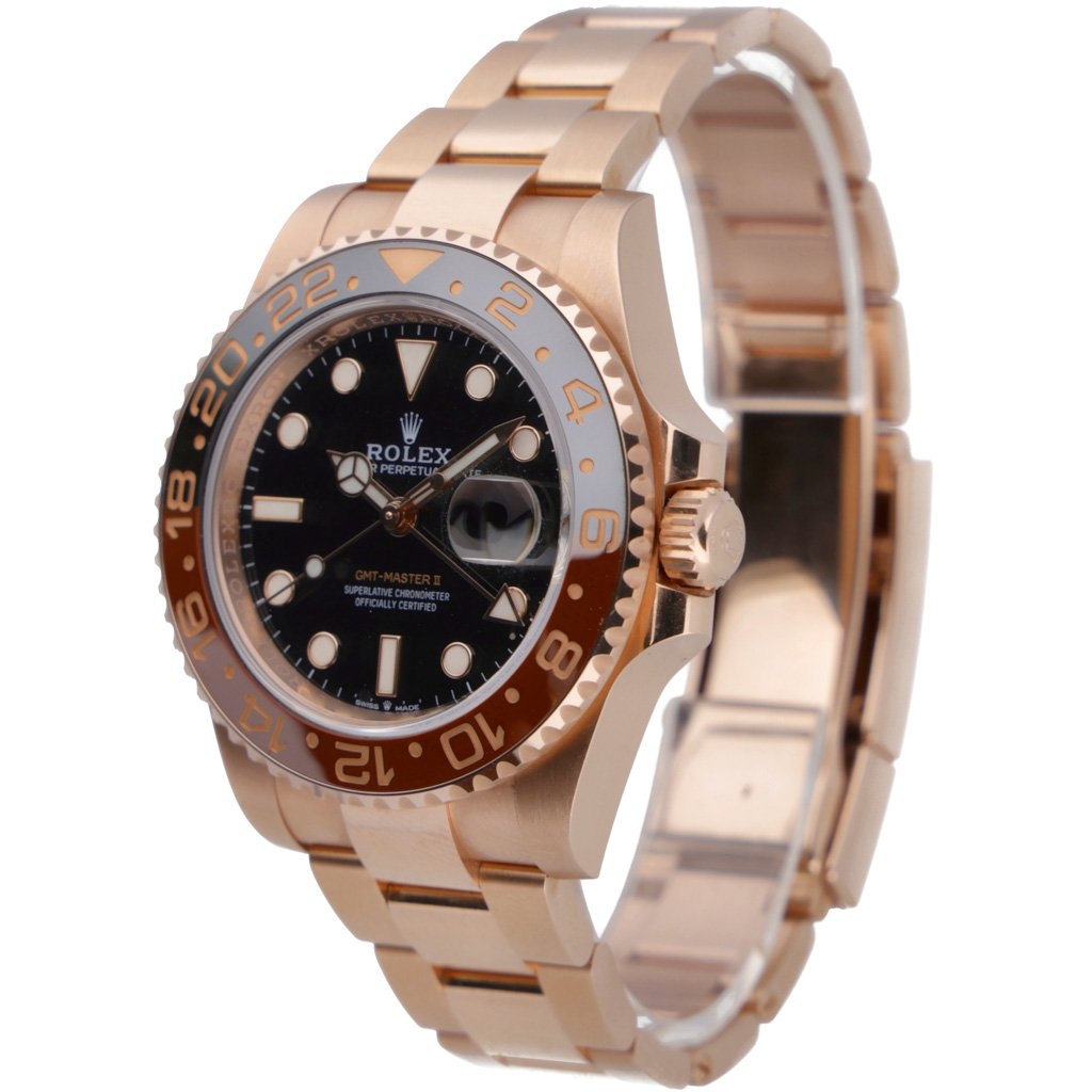 A Rolex GMT-Master II Watch, Full 18ct Rose Gold with a Black/Brown Bezel on a Black Dial