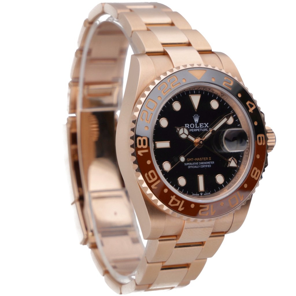 A Rolex GMT-Master II, model 126715CHNR, is an exceptional example of fine craftsmanship. It is crafted from 18ct rose gold for a truly luxurious feel. Its striking black-and-brown bezel beautifully contrasts with the black dial, creating a timeless yet modern aesthetic. The 40mm case size perfectly balances presence and wearability, making it versatile for everyday wear and special occasions. Whether worn casually or dressed up, this stunning watch stands out in any setting.