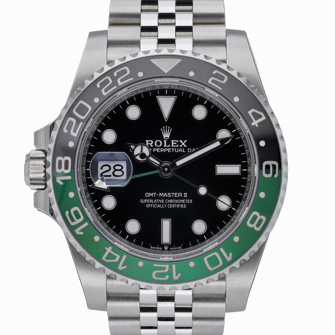 A Rolex GMT-Master II Watch that breaks convention with bold innovation, this 2023 model 126720VTNR—nicknamed the "Sprite"—is one of the most distinctive releases in the modern Rolex lineup. Crafted in robust Oystersteel, the 40mm case is paired with a striking black-and-green Cerachrom bezel, offering a fresh take on the iconic GMT aesthetic.