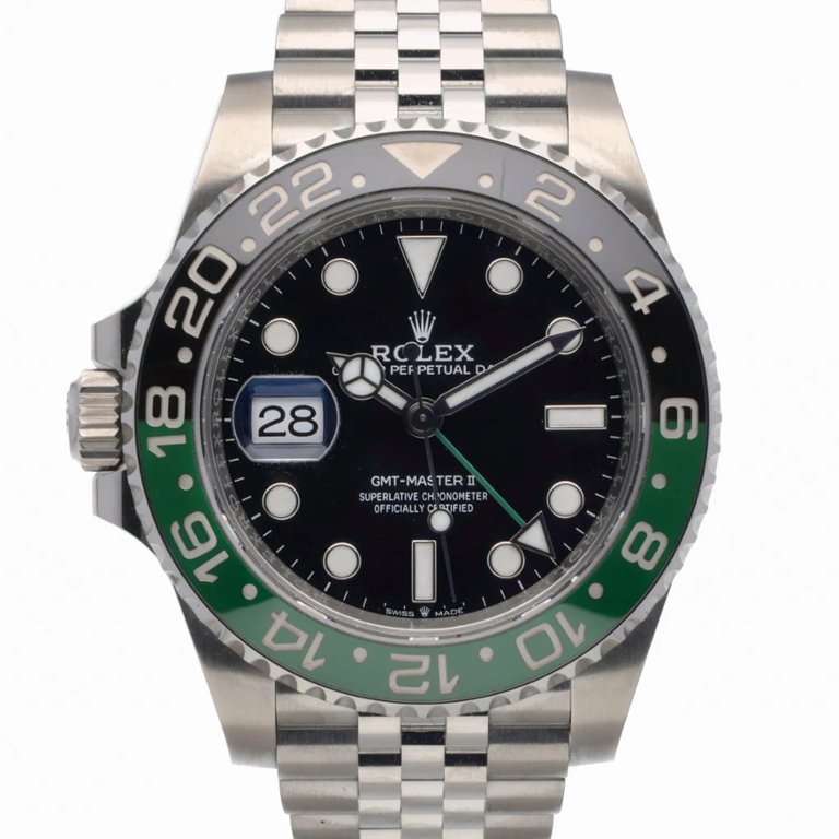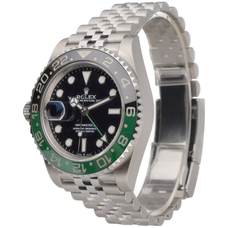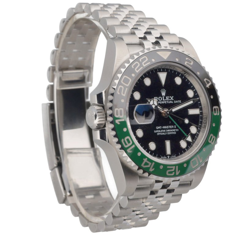 A Rolex GMT-Master II Watch, model 126720VTNR, crafted in stainless steel with a striking green and black Cerachrom bezel and a sleek black dial. Known as the “Sprite” among collectors, this 40mm model features the signature left-hand crown position — a bold departure from traditional GMT models — and is powered by Rolex’s advanced calibre 3285 automatic movement offering a 70-hour power reserve and dual time zone functionality.