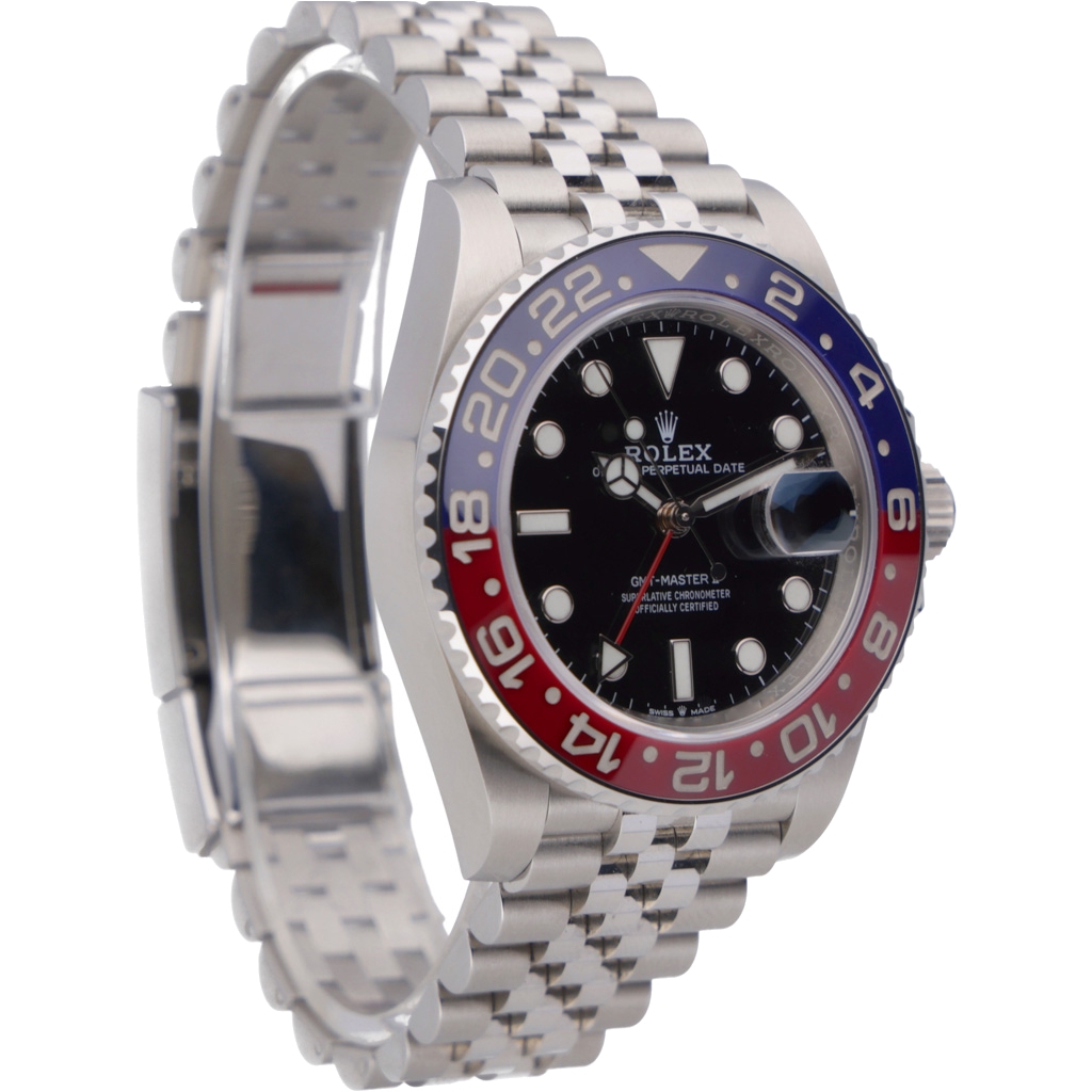 A Rolex GMT-Master II Watch, Stainless Steel with a Blue & Red Bezel on a Black Dial.