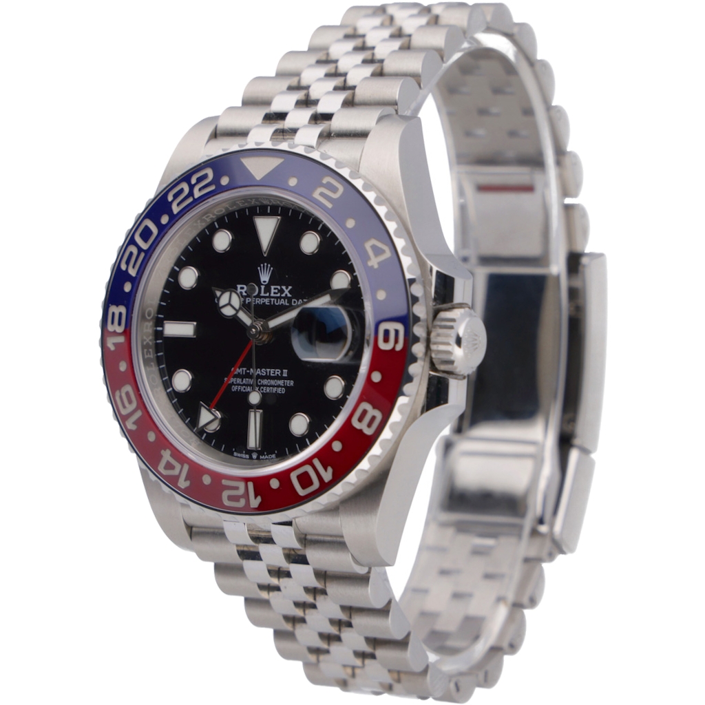 A Rolex GMT-Master II reference 126710BLRO, recently discontinued by Rolex. crafted from stainless steel and featuring the iconic blue-and-red Cerachrom bezel paired with a classic black dial. Known as the “Pepsi,” this configuration is one of the most recognisable within the Rolex line-up, blending heritage design with modern execution. The 40mm case offers balanced proportions, while the Jubilee bracelet enhances both comfort and its vintage-inspired aesthetic.
